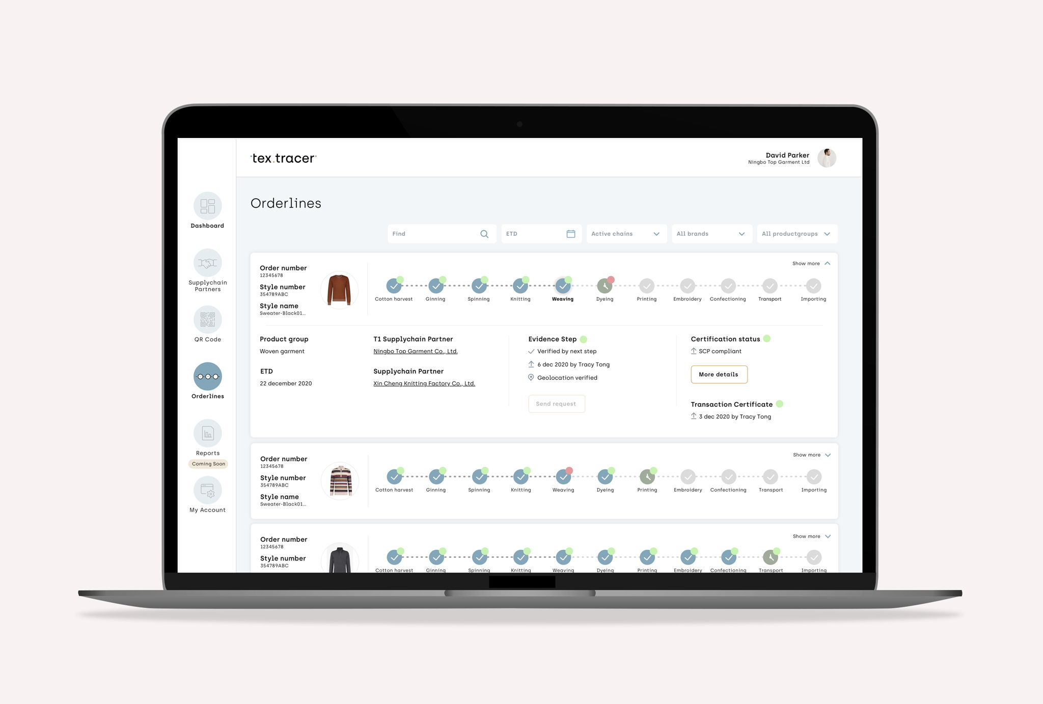 Following a soft launch at the start of 2021, early tex.tracer users included 10 brands with 200 orders going through the system. With an average of 10 supply chain stakeholders per order, this amounted to around 2,000 interactions. -
