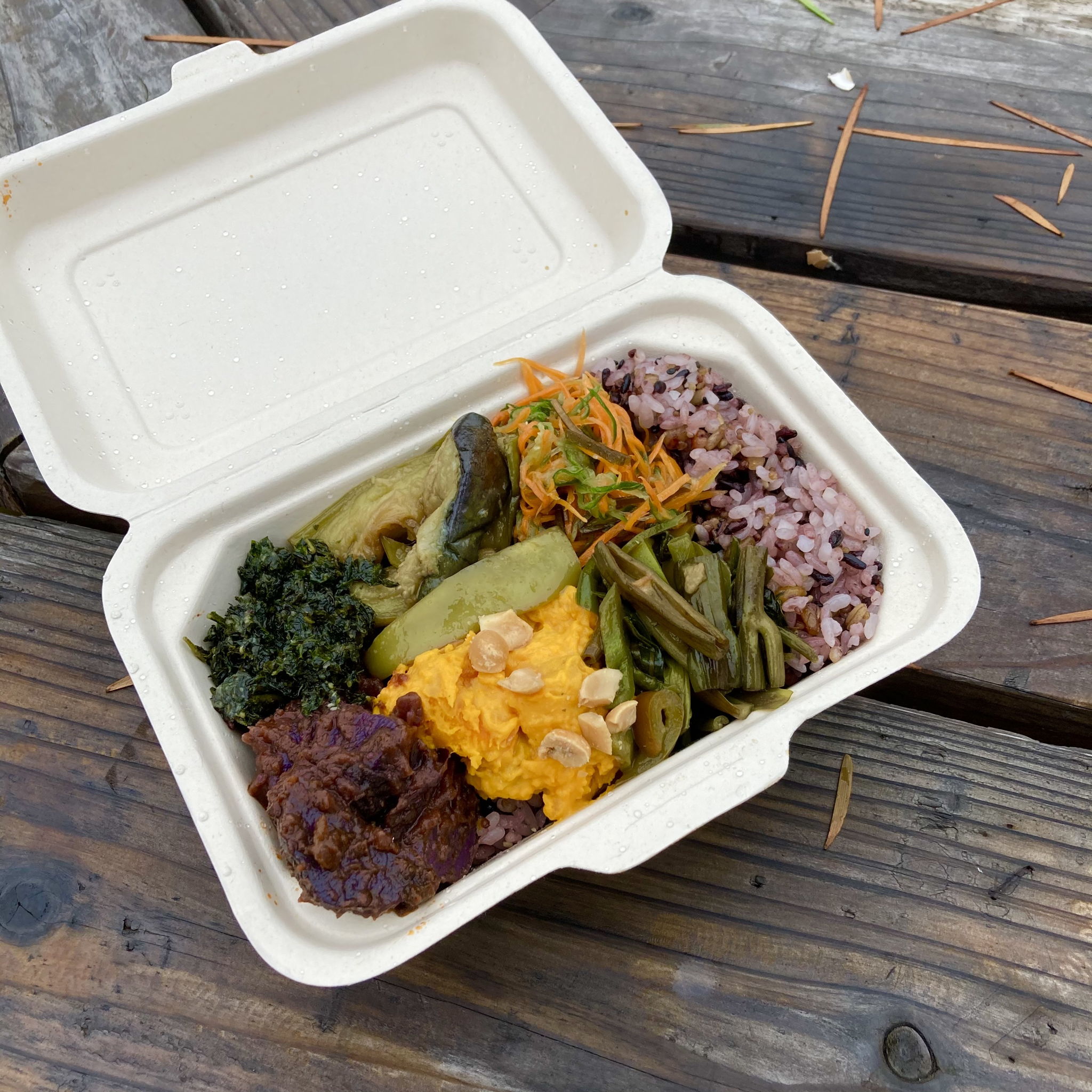 イベント開催までの流れとしては、毎週スタッフが地元の農家3名と連絡をとって、余剰野菜・規格外野菜・廃棄寸前野菜等が発生している際に受け取りに行くことから始まります。それぞれの農家の希望に沿って、買取または対価としての農作業を行います。その後、提携しているシェフに店舗横のキッチンカーでお弁当を作ってもらい、お客様に提供します。容器については、持参いただいた方には割引をしており、持参いただかなかった方には竹パルプやPLA、バガスを使用した容器で提供しています。使用後の容器は堆肥化し、店舗の畑で使用しています。