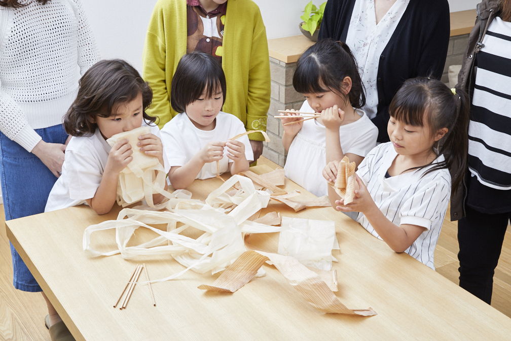 Wood sliced into 0.15mm strips had a problem of splitting along the grain when simply rolled into a straw shape when picked hard, but by rolling it into a spiral shape, we succeeded in making the wood look beautiful and strong at the same time. The process of slicing the thinned wood into ultra-thin slices was invented from "planing," which has been indispensable in lumbering since ancient times. By minimizing the amount of glue used for gluing, we succeeded in preserving the exquisite softness and smoothness of the wood. In addition, the materials used are mainly domestic lumber, including wood from thinning. By repeatedly cutting down and planting trees, the materials can be recycled, making it a sustainable material.