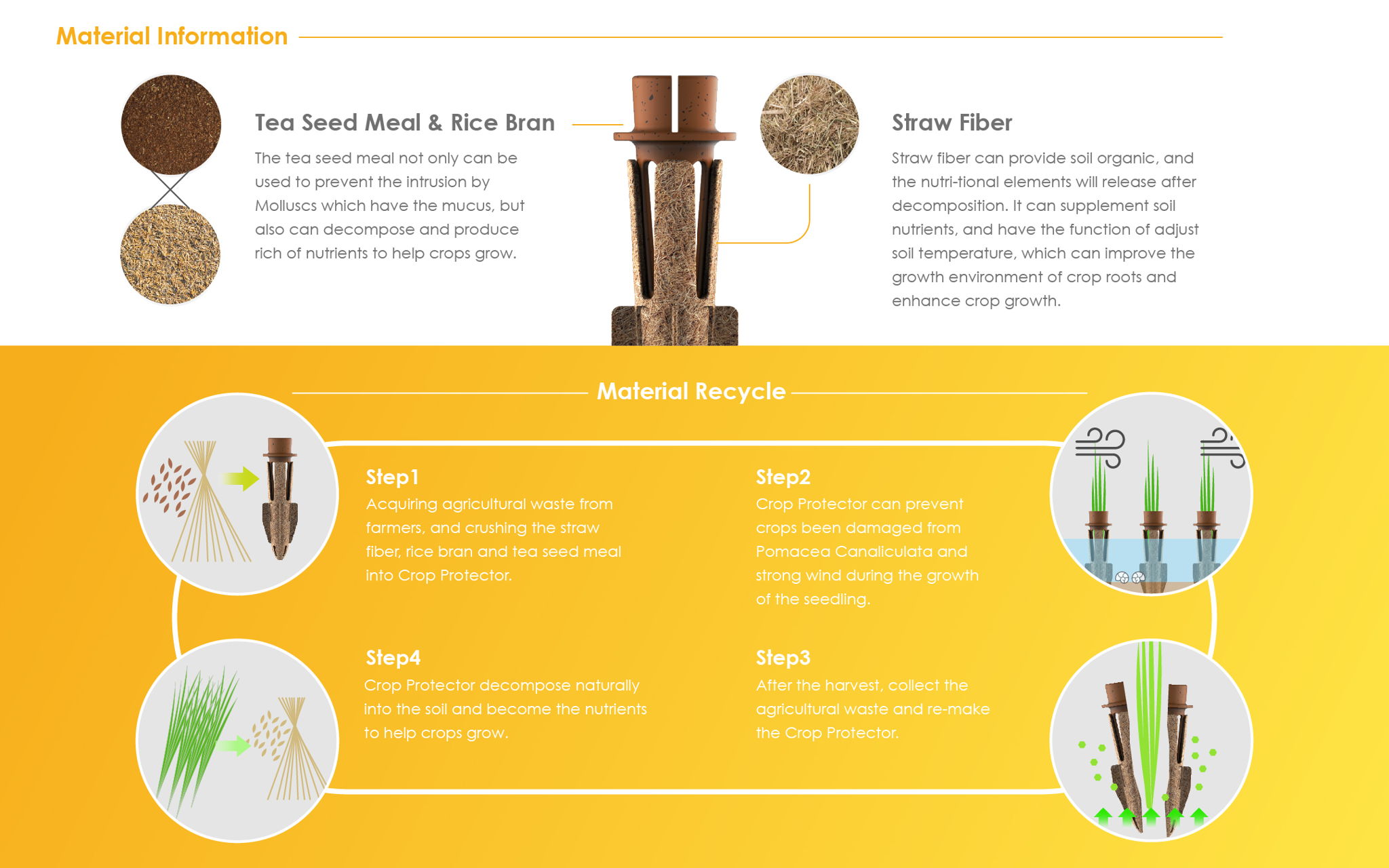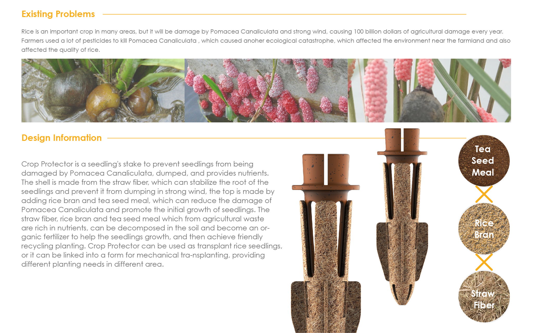 Crop Protector is a seedling's stake to prevent being damaged by Pomacea Canaliculata and wind damaged. The shell is made from straw fiber, which can stabilize the root and prevent dumping in a strong wind, the top is made by rice husk and tea seed meal which can drive away from the Pomacea Canaliculata. These three materials from agricultural waste are rich in nutrients, can decompose in the soil, and become nutrients to help crops grow to achieve friendly planting.