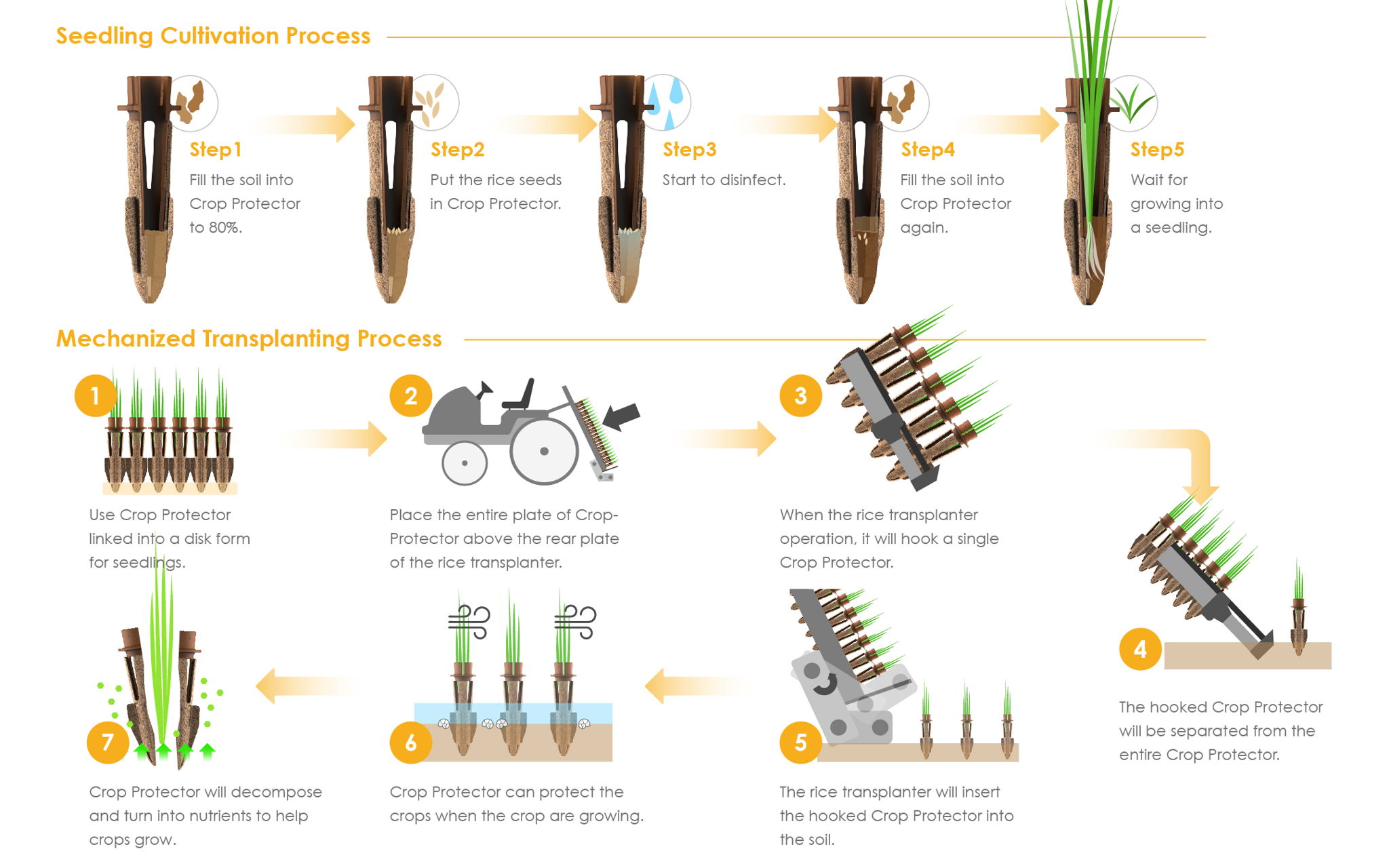 Crop Protector is a seedling's stake to prevent seedlings from being damaged by Pomacea Canaliculata, dumped, and provides nutrients. The shell is made from straw fiber, which can stabilize the root of the seedlings and prevent itplate ofumping in strong wind, the top is made by adding rice bran and tea seed meal, which can reduce the damage of Pomacea Canaliculata and promote the initial growth of seedlings. The straw fiber, rice bran, and tea seed meal which from agricultural waste are rich in nutrients can be decomposed in the soil and become an organic fertilisr to help the seedlings grow, and then achieve friendly recycling planting. Crop Protector can be used to transplant rice seedlings, or it can be linked into a form for mechanical transplanting, providing different planting needs in a different area.