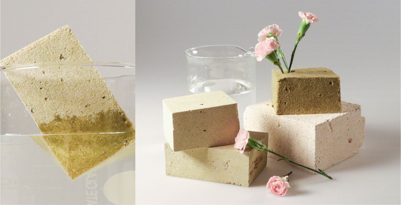 2. Bio-(floral) Foam: made of 100% fibre from flower stem (mainly carnation and iris). The material aims to simulate and act as an alternative for phenol-formaldehyde foam (floral foam) with its properties of water-absorbent, ability to hold flowers, biodegradable, no oil-based ingredient or additive, 100% flower, hence microplastic-free.