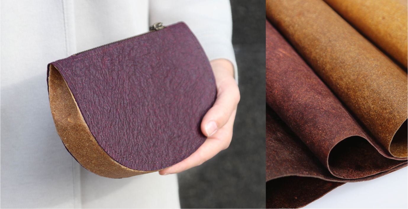 3. Flaux (/floʊ/): is a nonwoven-textile/ flexible sheet/ leather-like material. The material contains flower petals (mainly rose and carnation) as the main ingredient and colour agent for the material. Therefore, no artificial colourant is needed. The material also contains no oil-based ingredient or additive. Flaux can be made into all kinds of lifestyle products e.g. bags, wallets, shoes etc.