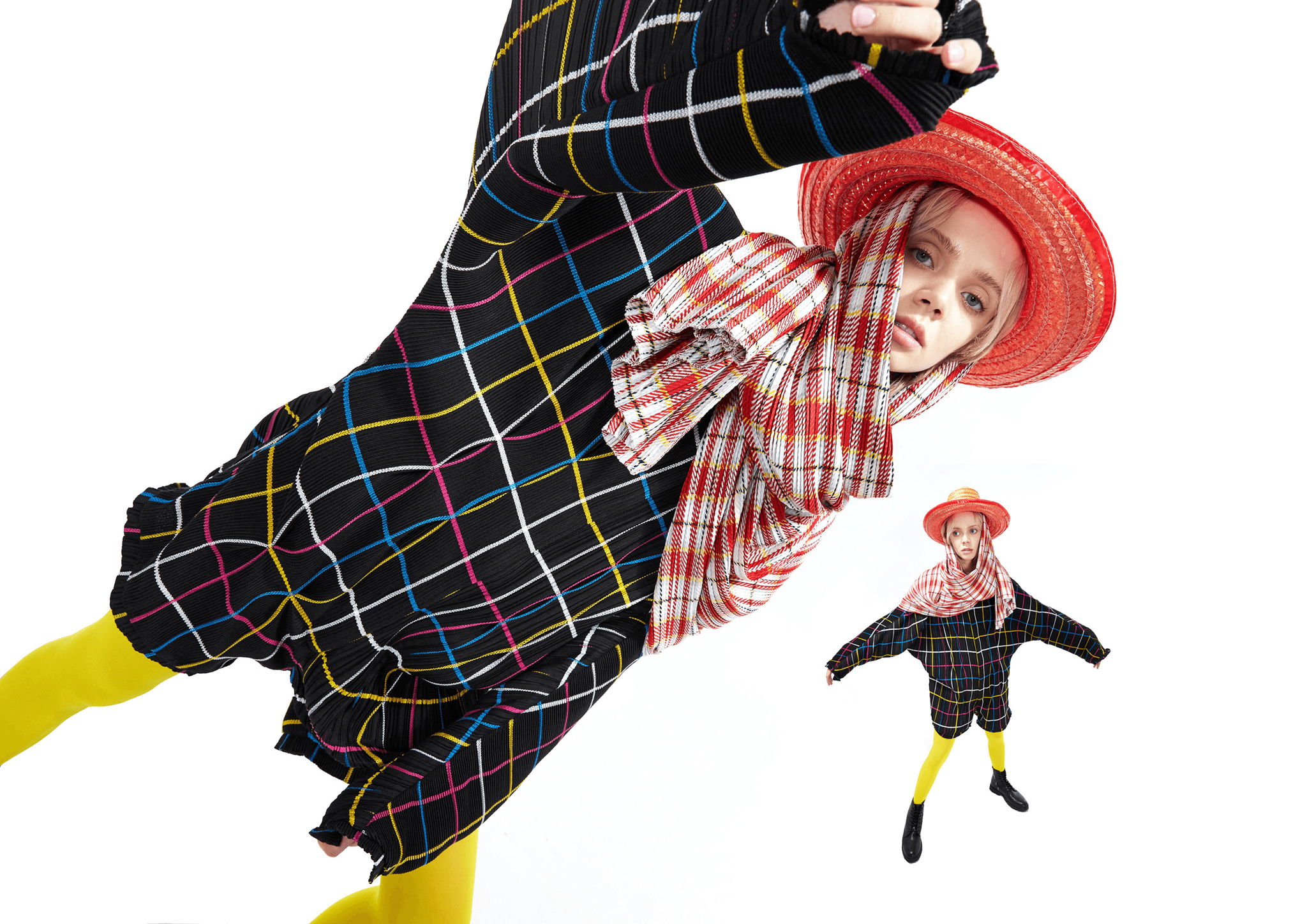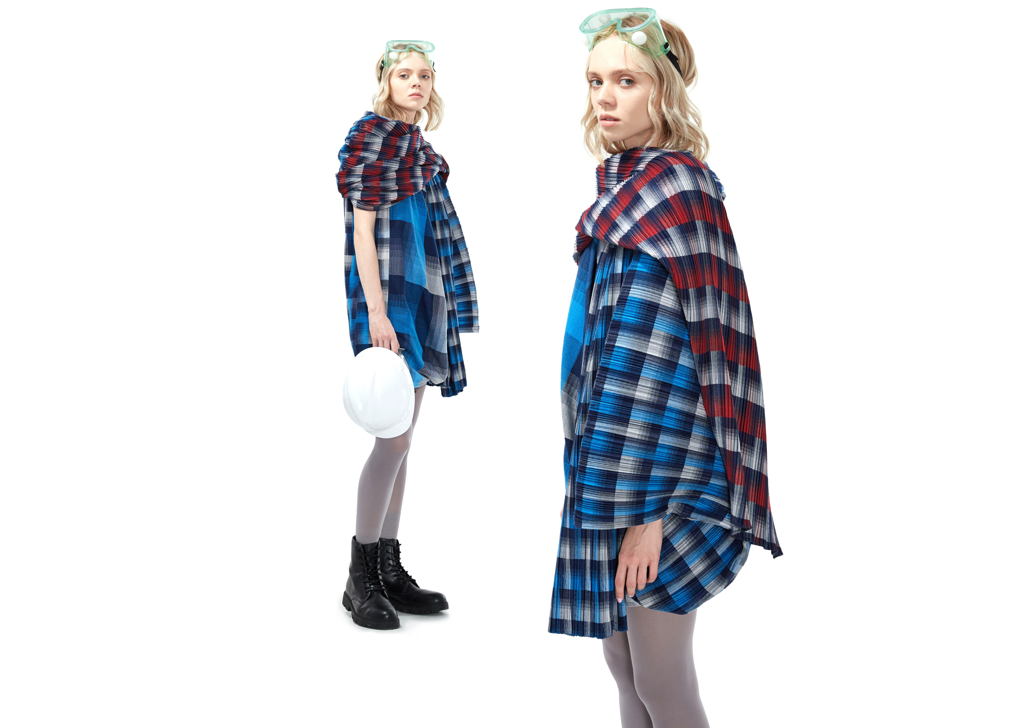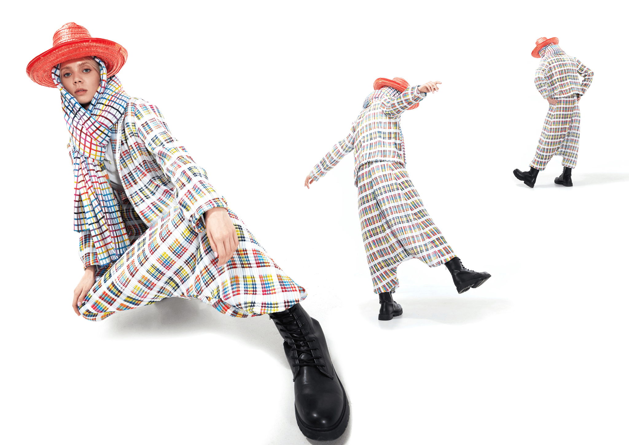 This collection is inspired by one of Thailand’s most significant fabrics, Kaoma. Kaoma is a multipurpose textile that has been a huge part of Thai’s way of life for centuries. The graphics on our handwoven fabrics are derived from Kaoma’s original aesthetics, which are bold, and colorful checkered images. Pleated structure is another detail that we have incorporated across the pieces to add our own twist into the outfits. Pleating allows the textiles to become more hybrid, as they can stretch into the user’s body differently, maximizing adaptability and versatility.