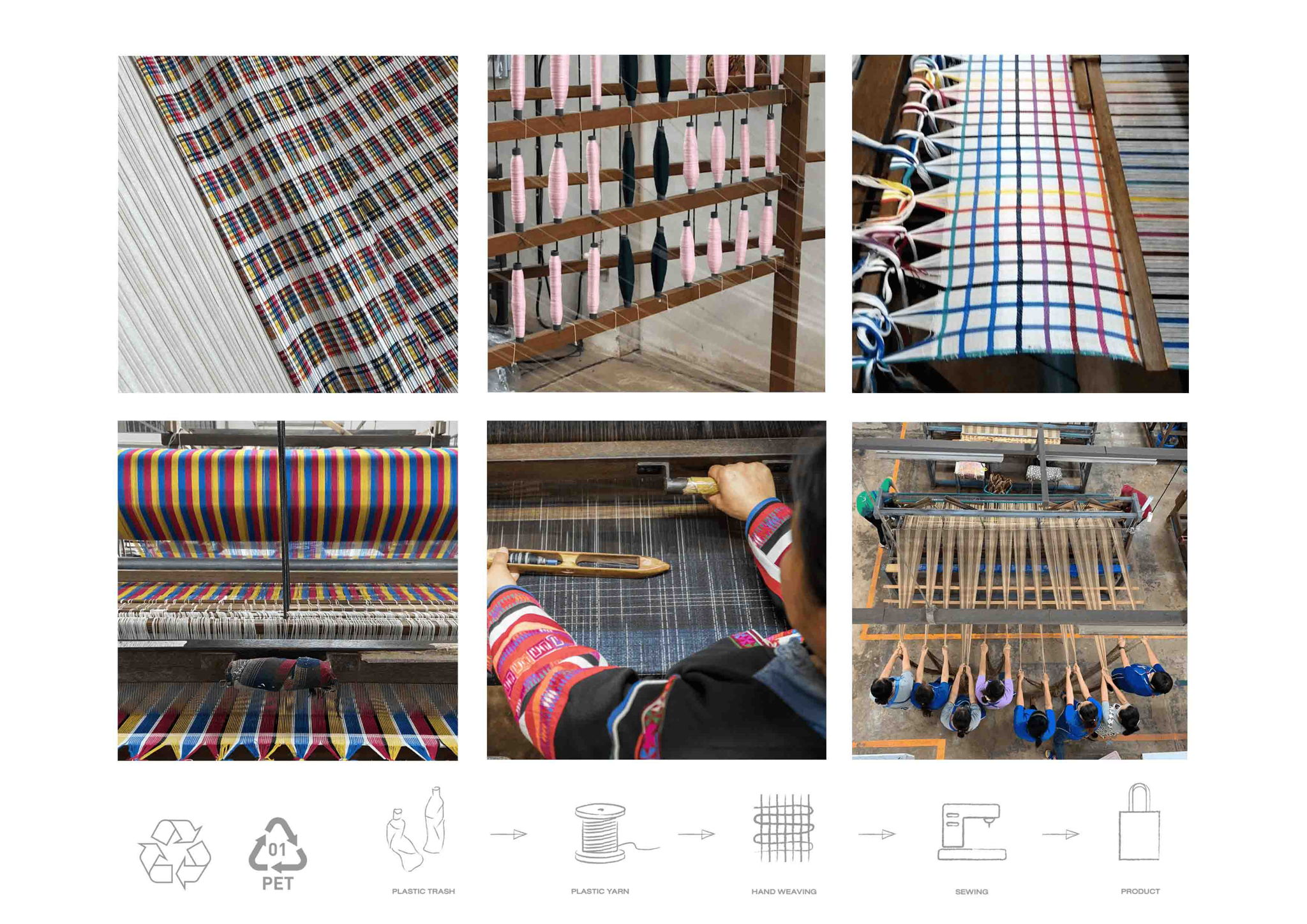 Recycled PET yarn has been selected to serve as the material in our hand woven collection of clothing. The process of Recycled PET yarn is begun by collecting plastic bottle trash, commonly found in the Thai Ocean. These plastic waste then undergo a recycling process in order to be reproduced into usable yarns. We adopted the philosophy of the Circular Design System to make the most out of all the existing resources, and lower use of new supply. This process minimized the use of new energy up to 30% when compared to extruding yarns from Virgin Polyester.
