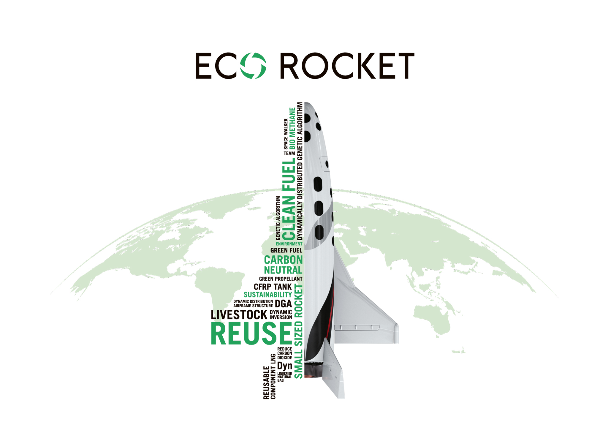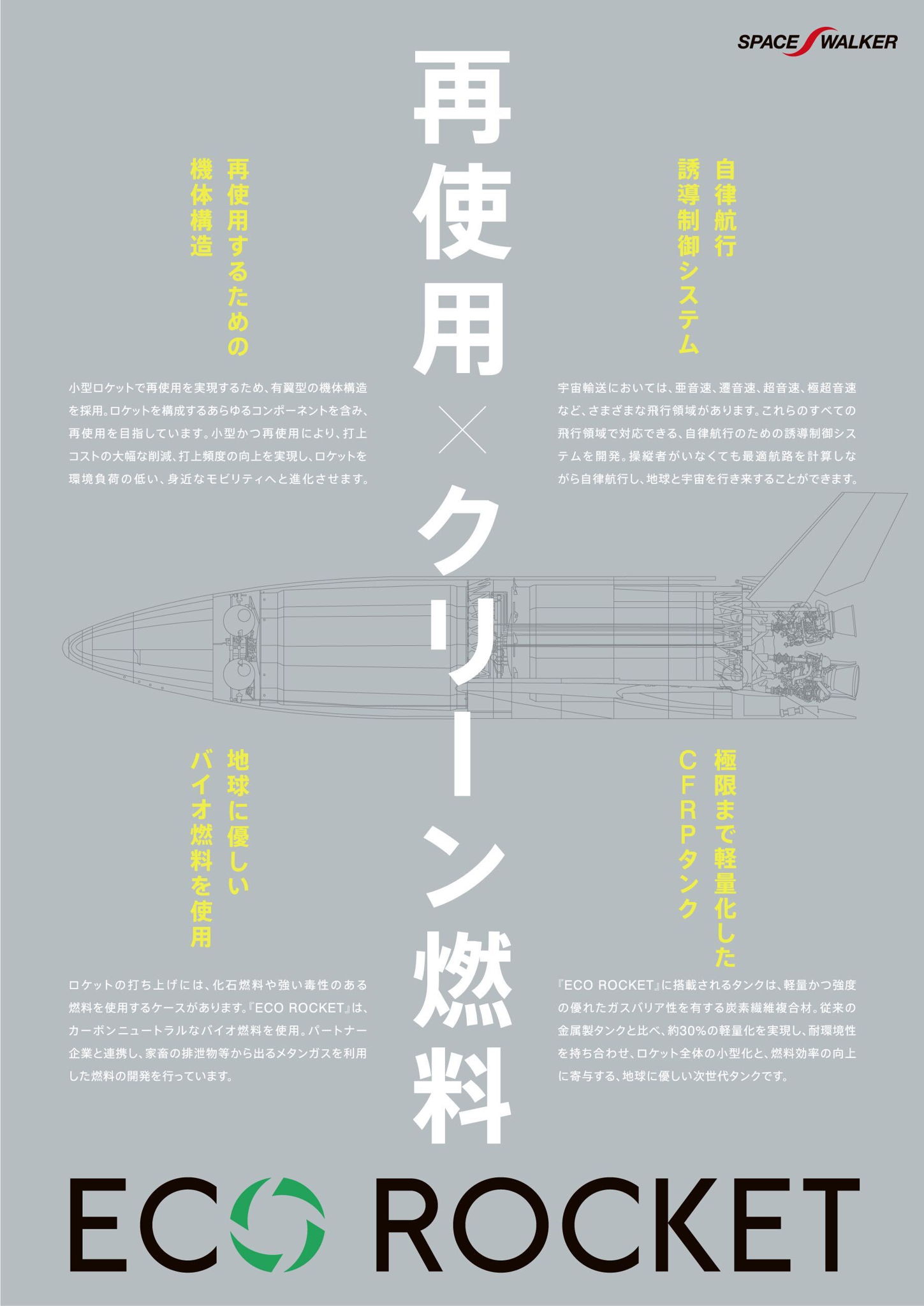 有翼ロケットを開発する SPACE WALKER は、今後、ロケットが宇宙輸送やモビリティとして定着することが現実を帯びるなかで、使い捨てロケットに支えられた宇宙開発の現状を懸念しロケットの再使用化とクリーン燃料(牛糞から抽出した液化メタン)を要件とする、「ECO ROCKET」を開発している。
