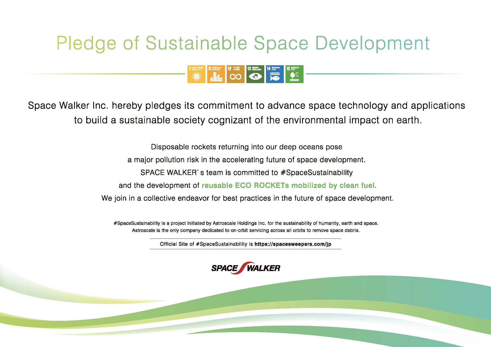 In March 2021, SPACE WALKER released a Pledge of Sustainable Space Development as part of its commitment to the Sustainable Development Goals, addressing concerns caused by the current space development mainly supported by expendable rockets. This was followed up by our press release on 5 June 2021, World Environment Day, when we announced ECO ROCKET, a project that embodies our aforementioned pledge.