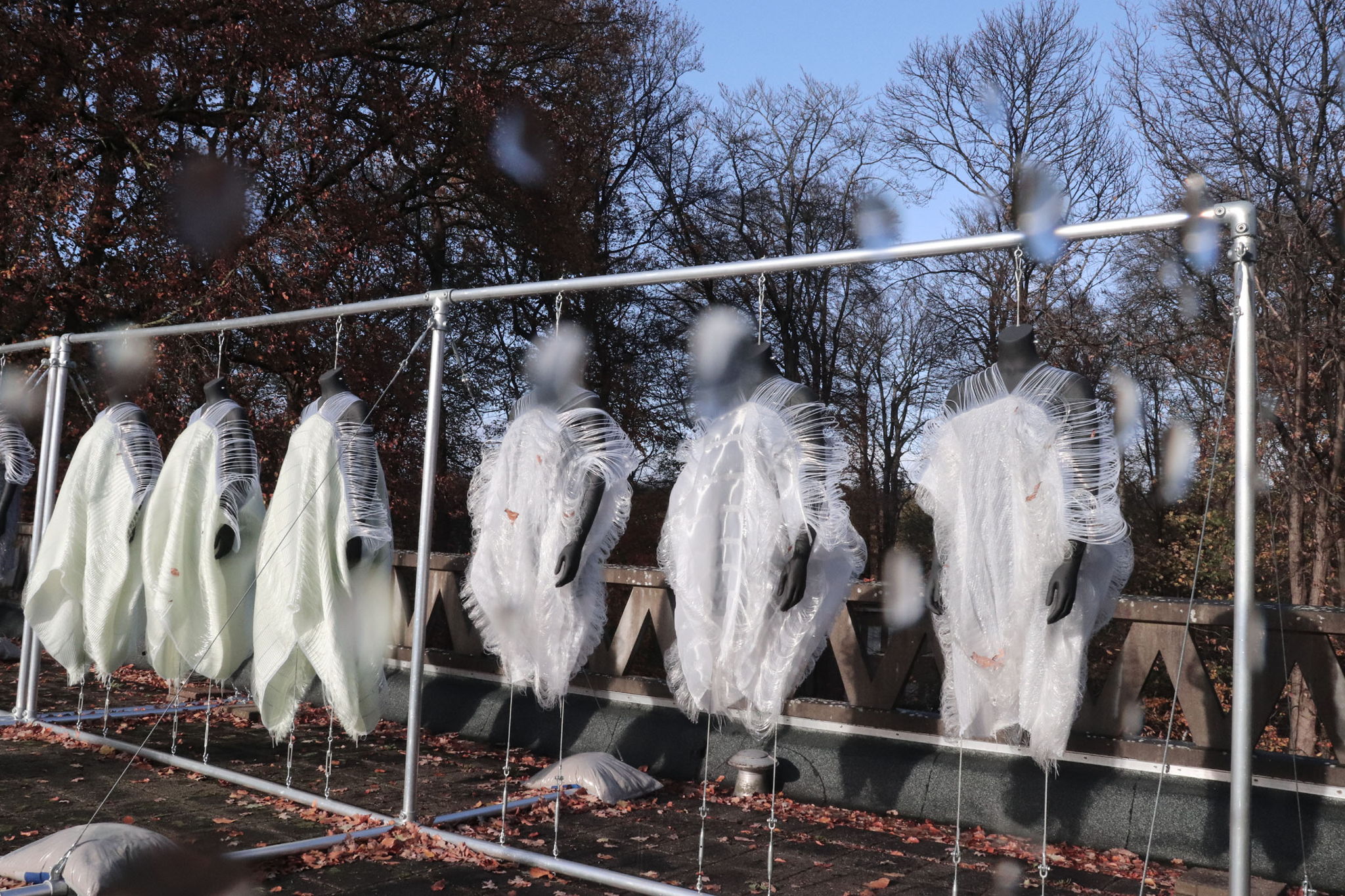Inspired by the contrast of the sea and plastic pollution. Marinero is the first project of Studio Adaptive Skins. The focus of Marinero is to create an architectural blueprint that transforms organically over the course of time due to different weather conditions. The blueprint is one woven square that forms the base of diverse variations. All produced Marinero fabrics are used (no waste). Because the finishing is already incorporated within the woven pattern, the materials take its shape by the various conditions, rather than using traditional cutting and tailoring techniques. The materials used to create yarns for the woven square are divided into several categories. The main categories are: 1 Adaptive Archi-Filament A+B (designed yarn by Jef Montes & produced in collaboration with partners: Aitex Alcoy and Wood K Plus in Linz), 2. Rpet (recycled plastic waste from the sea) 3. PLA (Bioplastic); 4. Seacell silk yarns that are dyed with algae pigment. The vision is to design a new kind of production system resulting into adaptive garments that grow with us individually. The woven fabrics have a warp of monofilament and a weft of integrated variable sustainable threads. The combination of these threads (horizontal versus vertical) cause friction and result into dynamic shapes during different meteorological conditions such as: rain, heavy wind or drought. The design follows the material. All woven and knitted materials were produced at TextielLab Tilburg. The tailored by weather installations are developed with local talented artists from Arnhem. During the final stage of the project all 66 textile designs were placed in open air installations. The Marinero garments have been installed on the rooftop of a chemistry laboratory. This experiment lasted 6 months total. All data collected results, in terms of best design balance filament versus technique, are published open source online.