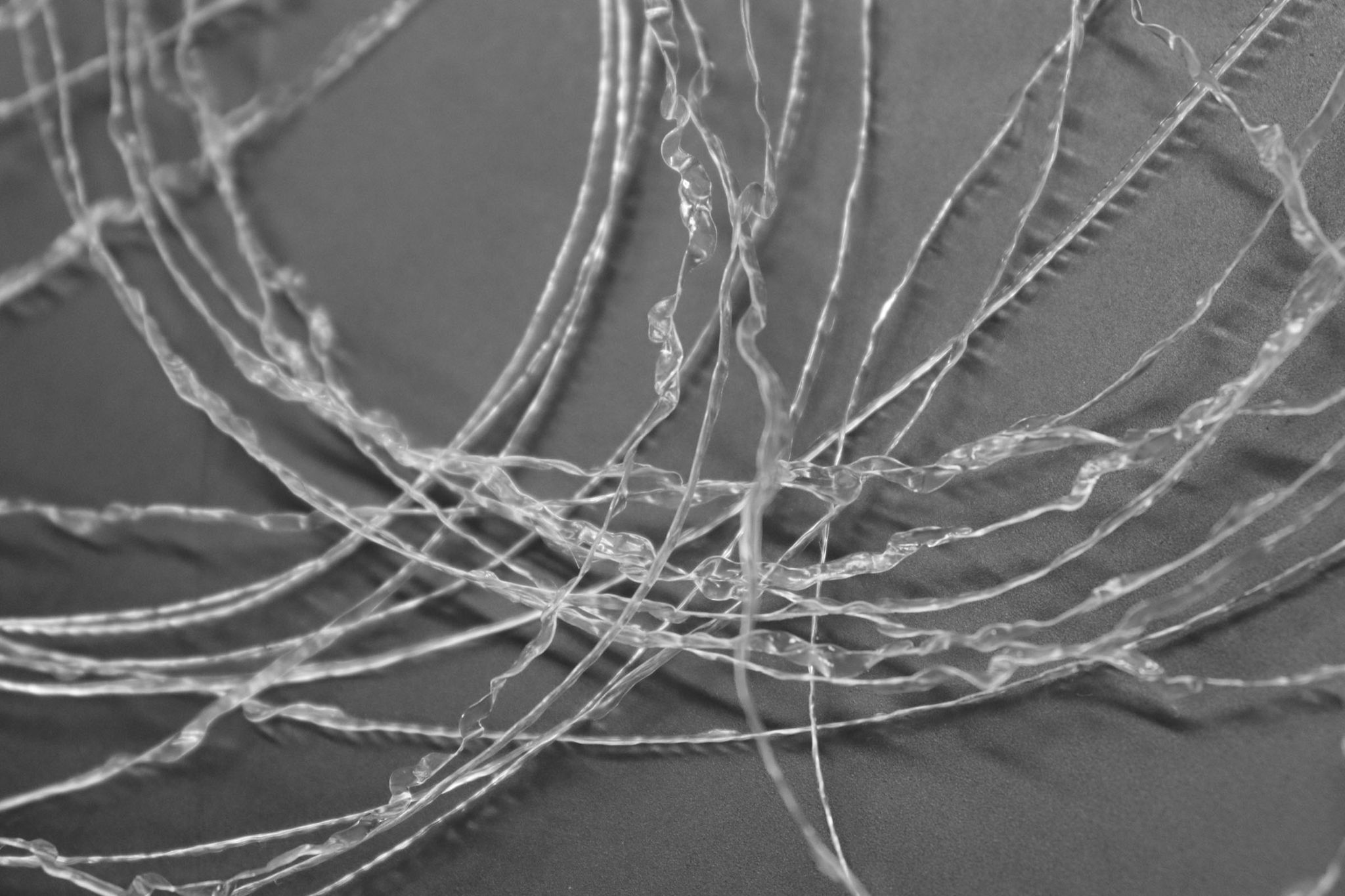 In order to emphasize the deformation of the textile it was needed to create conceptual yarns. The Adaptive Archi-Filament was developed in collaboration with Horizon 2020 co-creation tech platform. I collaborated with Aitex Textile Institute Valencia, Johannes Kepler University Linz, Empa federal material laboratories St. Gallen and Wageningen University Research. The idea of the sustainable produced filament is to block deforming mechanisms inside a firm bio-plastic coating. These soluble layers melt away with rain and start to deform within woven and knitted structures.