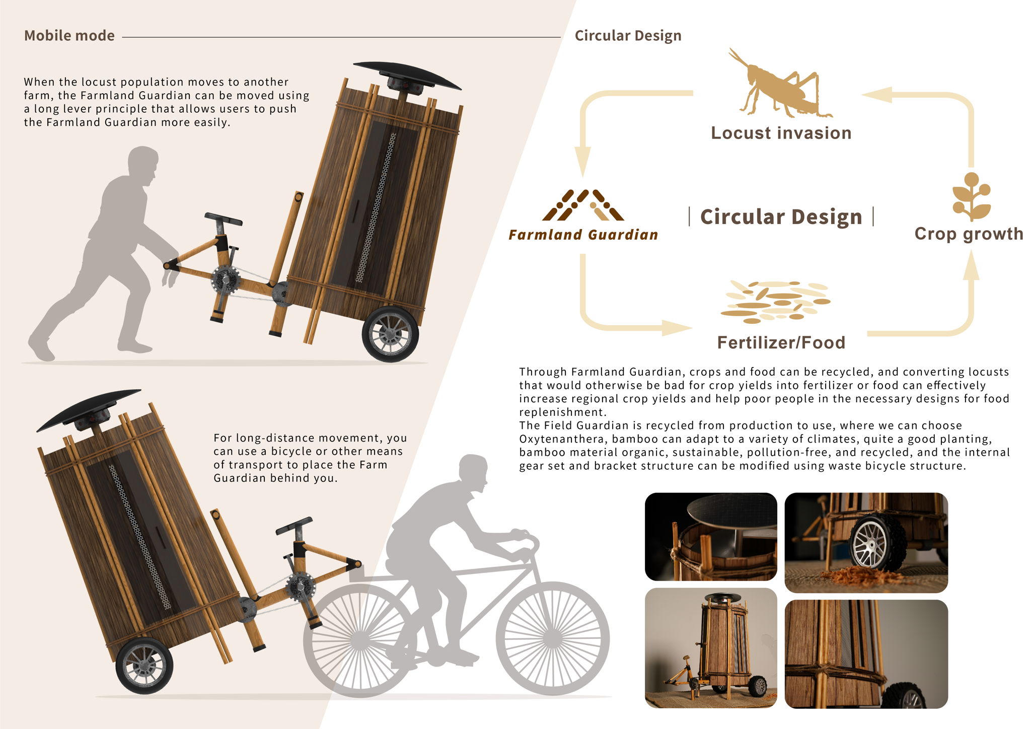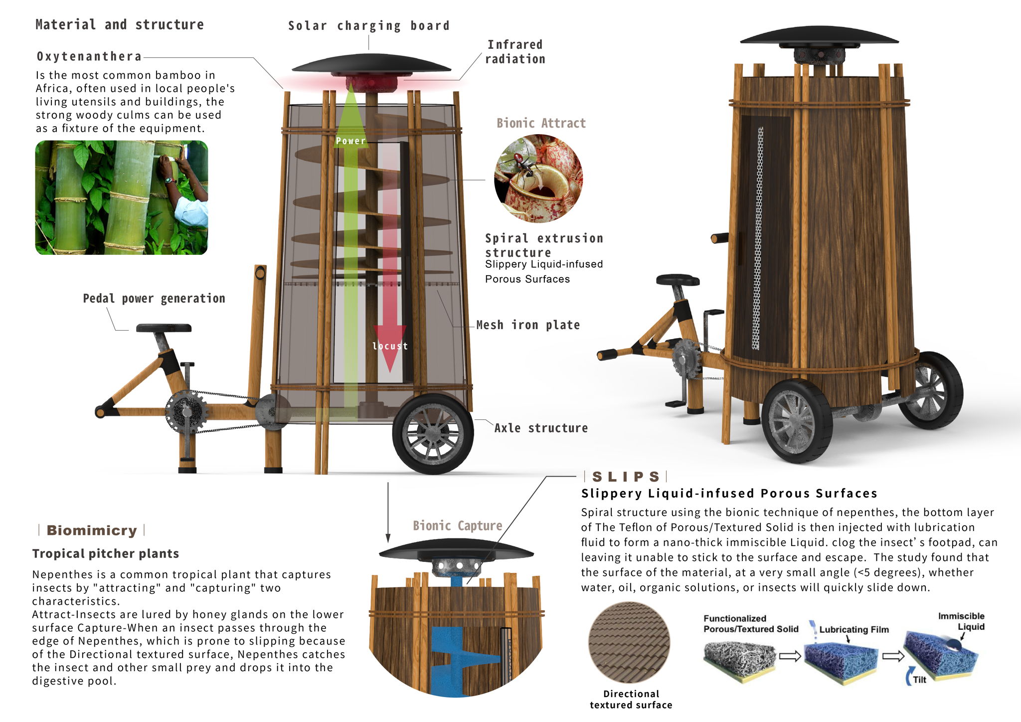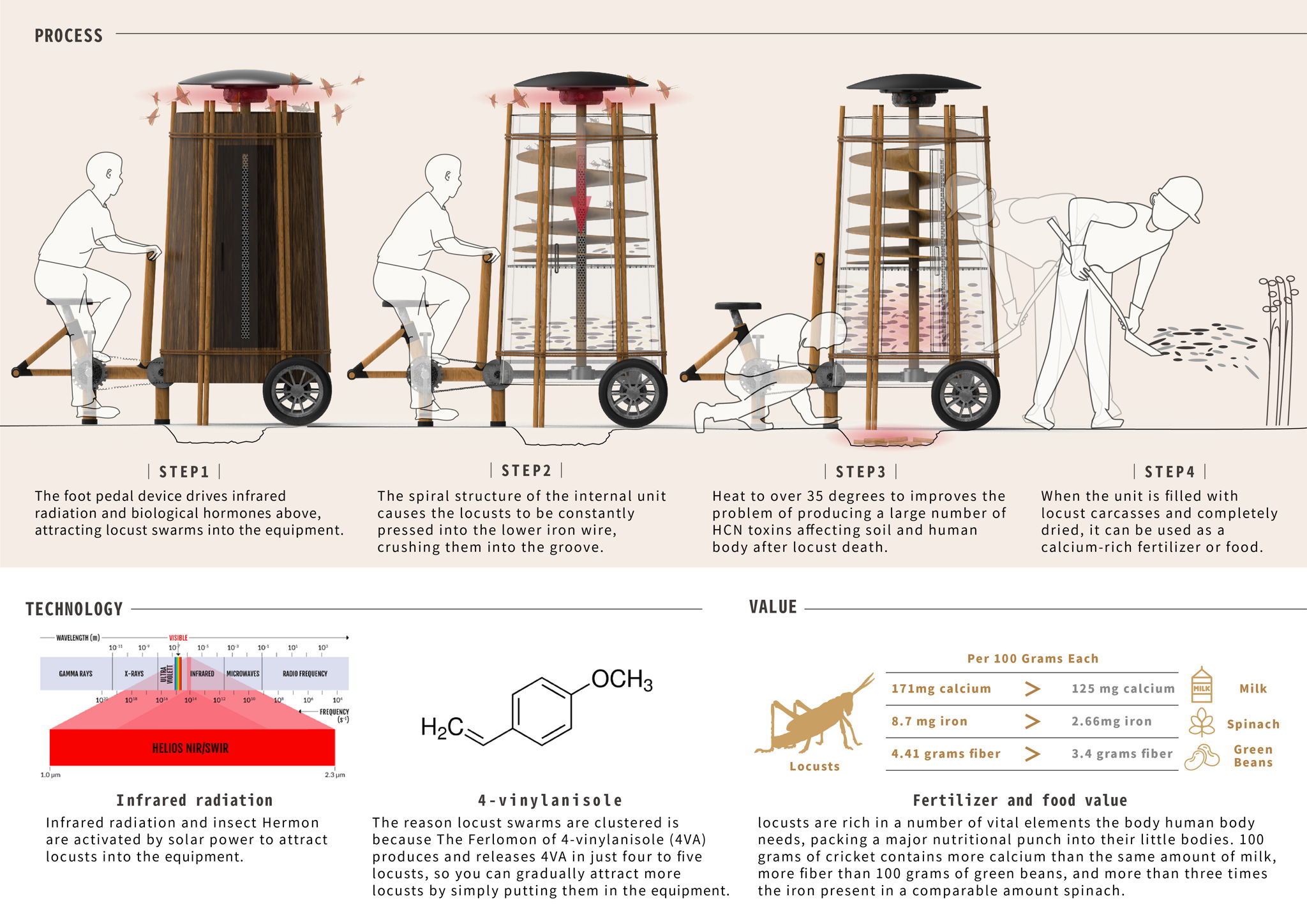 Farmland Guardian is a piece of agricultural equipment that attracts locusts and converts them into fertilizer through bionic nepenthes, reducing economic and agricultural losses caused by locust plagues in the Middle East and Africa, generates electricity by foot and turns internal gears, attracts locusts with infrared radiation and 4-vinylanisole, Using the bionic technique of pig cage grass, the bottom layer of The Teflon of Porous/Textured Solid is then injected with lubrication fluid to form a nano-thick immiscible Liquid. clog the insect’s footpad, can leaving it unable to stick to the surface and escape. and hangs locusts for agricultural fertilizer use; Improves the problem of producing a large number of HCN toxins affecting soil and human body after locust death, heating and brittle the locust shell as a calcium supplement for sandy soil. Farmland Guardian can move by hand or by connecting vehicles, allowing poor areas to use locusts as edible or agricultural fertilizers to reduce the damage locust pests cause to the environment and residents.