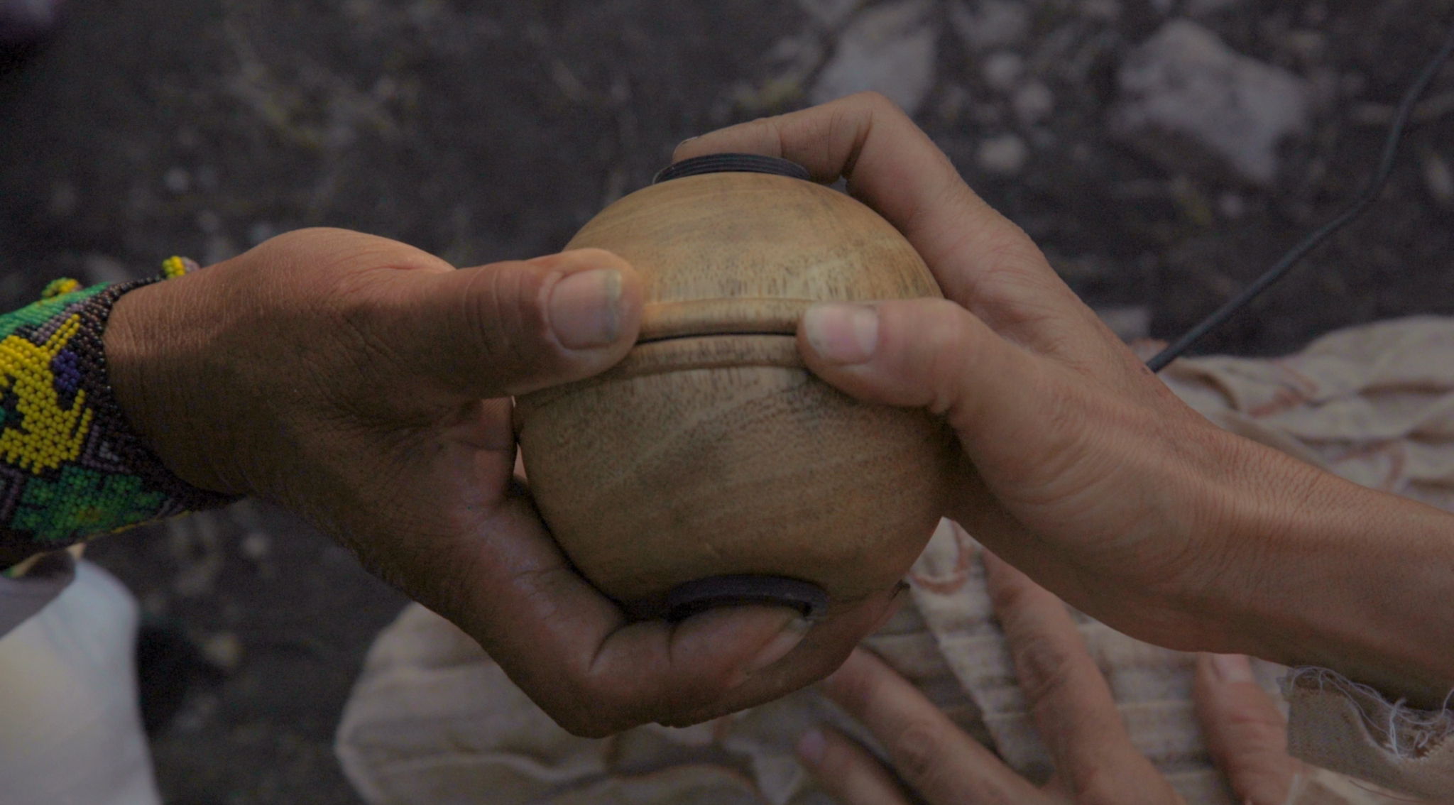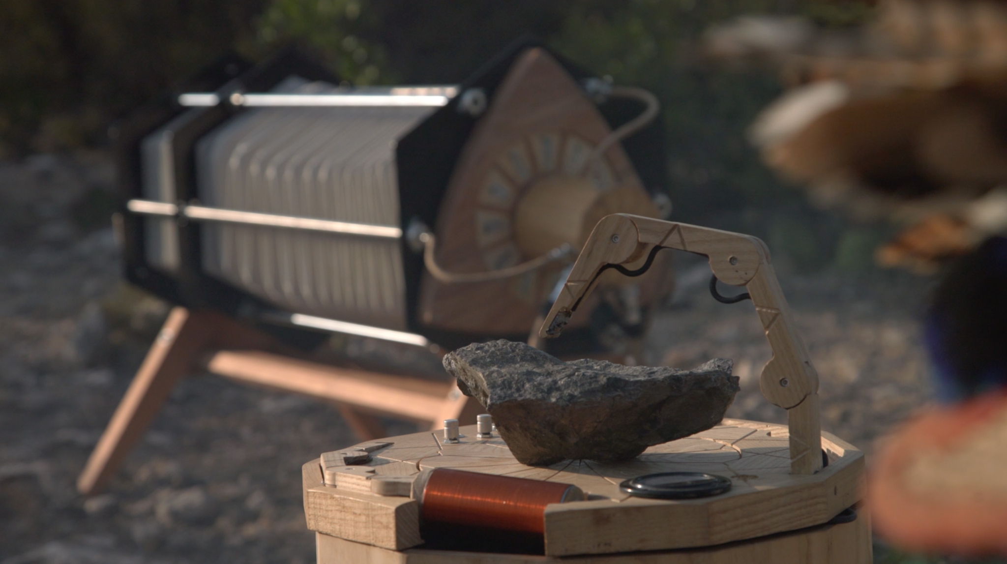 In 2017, 600 meters deep down into the mine, a Pyrrhotite fragment was borrowed. The mine is located in the Potosino plateau, in the Cerro del Frayle. This site is one of the ceremonial centers of the Wixárika community, known in their native language as Tsinamekuta, The House of Rain. The Wixaritari have pilgrimage through these lands for more than 10,000 years, forming part of a biocultural net, whose preservation is based on the sacredness of the Earth and all its inhabitants. This research has resulted in the construction of instruments to explore the possibilities of reading, interpreting, and rewriting the original memory of the rock. In the spring of 2021, Mara’akame Jairra, a member of the Wixárika community who makes a pilgrimage with his family every year to the sacred area where Tsinamekuta rises, he agreed to participate in a ceremonial act offered to the rock at the base of the Mountain. He thus accompanied his family, the ritual activation of an instrument that was built to sonify the magnetic memory of the rock. As part of this ceremony, the electrical signal from two human hearts -ours- was recorded in the rock by magnetic induction as a representation of an offering or payment, that must be left at the site where the ceremony is held, according to the traditions of the Wixárika people