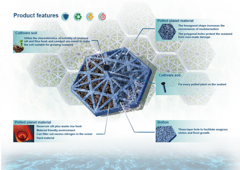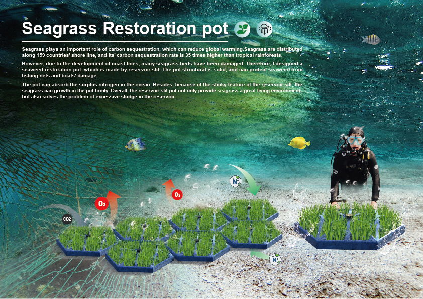 In recent years, seagrass has been affected by seine fishing, marine eutrophication, man-made destruction, etc. Therefore, I designed a seagrass restoration pot, which is made by the silt in reservoir. The structure can protect the seagrass, the reservoir silt can absorb surplus nitrogen in the ocean so as to prevent eutrophication. The silt soil in the pot can stabilize the seagrass more effectively than regular sand. At the same time, the modularized potted plant can be applied to the coastline efficiently, in order to accomplish fast restoration of the seaweed bed.