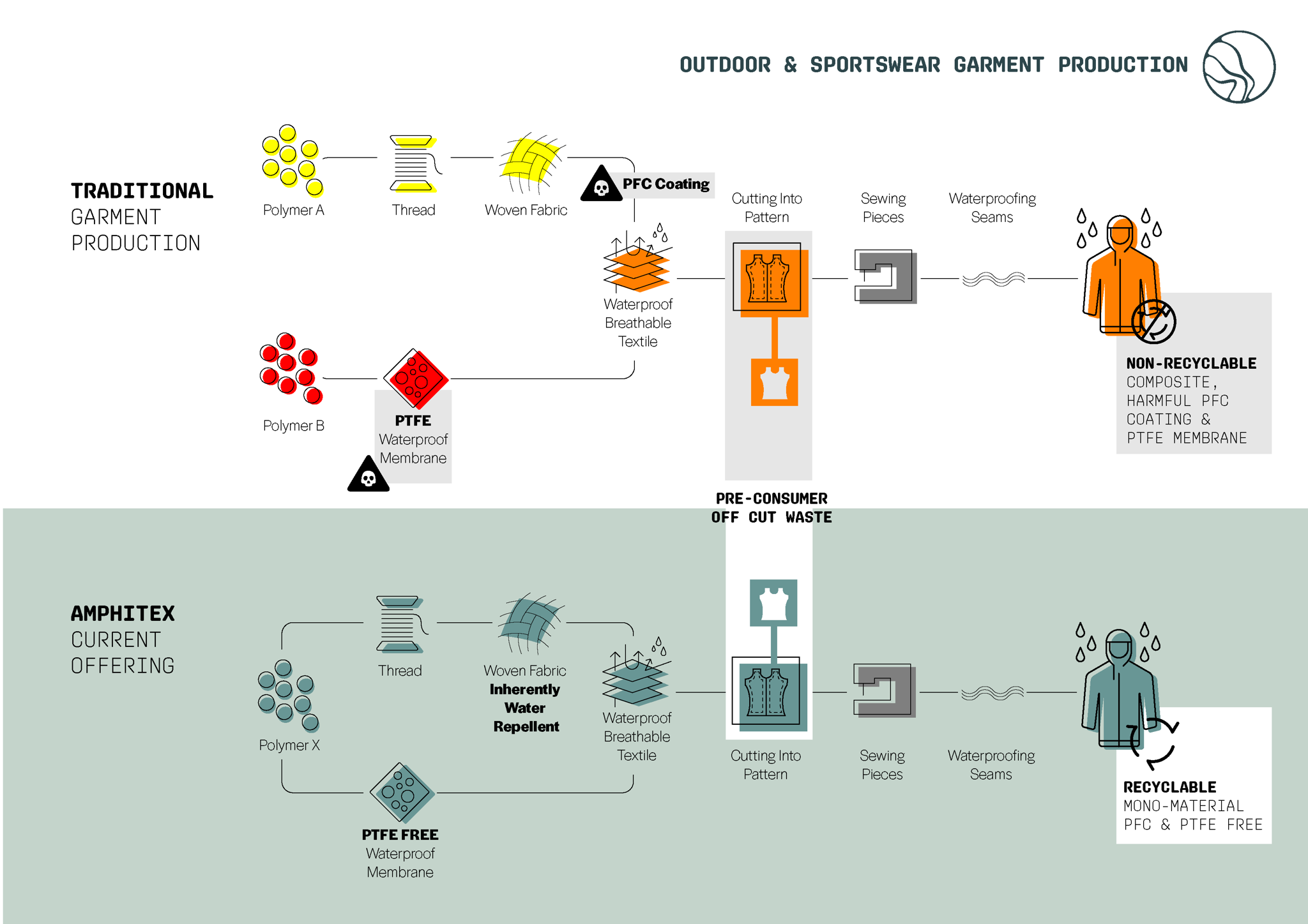 Amphitex is the first mono-material 100% recyclable high-performance WBT, which is free from PFCs & PTFE, coming to market at an opportune time to help manufacturers meet tightening regulations. -