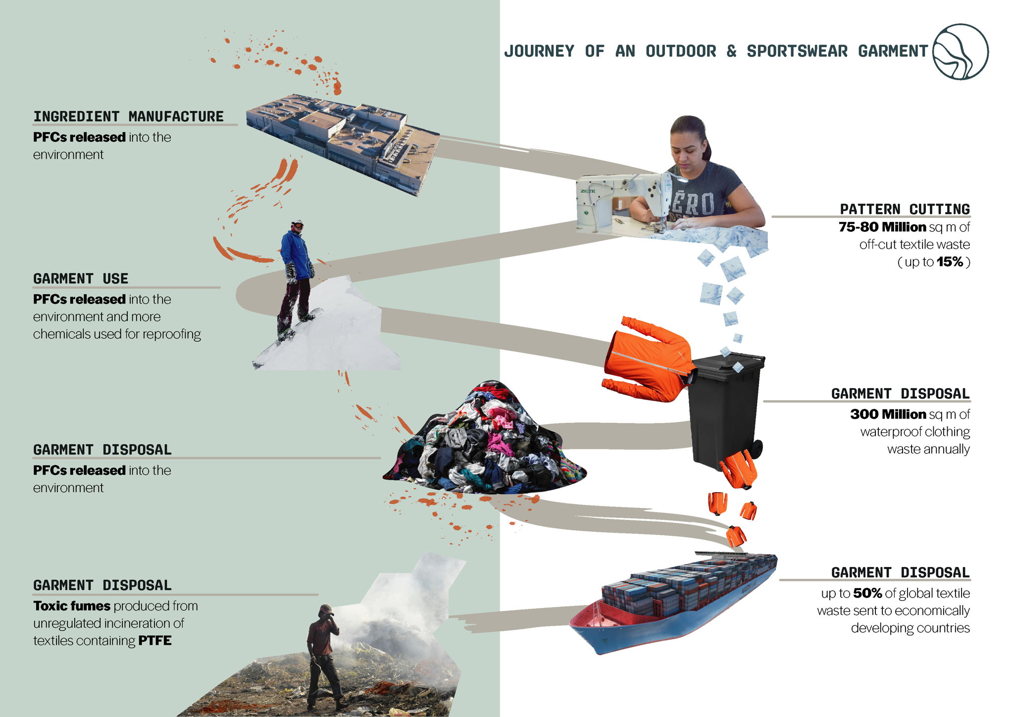 High-performance waterproof membranes are typically manufactured from PTFE (polytetrafluoroethylene, the main material in Gore-Tex). Chemicals rich in fluorine are also used as a water repellent coating on the outer fabric. These chemicals are called PFCs and are harmful to the environment and our health, because of this outdoor apparel brands are under increasing consumer and regulatory pressure to remove PFCs. There is currently an estimate of 5000 tons of PFC leaking into the environment from textile sources. Conventional WBTs are multi-material laminated textiles that are impossible to recycle. As a result over 300 million sqm of WBT face either landfill or incineration at end-of-life. During incineration, PTFE can produce highly toxic fumes. Garment manufacture requires large numbers of fabric cutters and sewing machine operators, with workers reportedly receiving far below minimum wage. Cut-and-sew production typically leaves about one-fifth of fabric as waste.