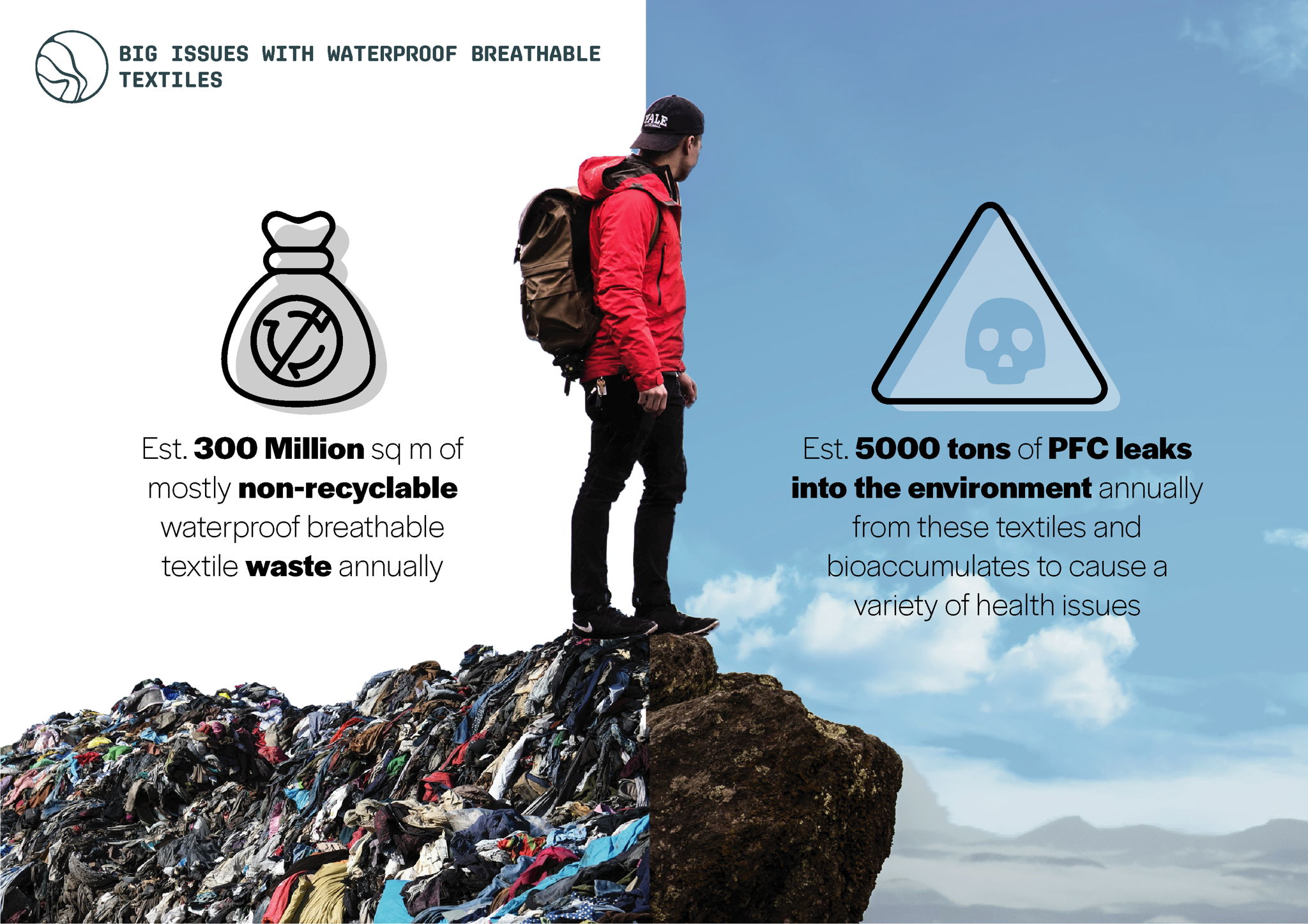 自然が好きな人には必須のアウトドアウェアですが、これらに使用される防水透湿テキスタイル(WBT)は、深刻な環境汚染を引き起こしています。異なる素材を接着して作られるWBTはリサイクルが不可能であり、毎年約3億m2の使用済みウェアが廃棄されています。また、生地を撥水にするためにPFCと呼ばれる有害な化学物質が使用されており、PFCは生物の体内に蓄積され多くの健康被害の原因となります。更に、ゴアテックスの様なWBTにはPTFE膜が使用され、これらは焼却処分時に有毒ガスを発します。