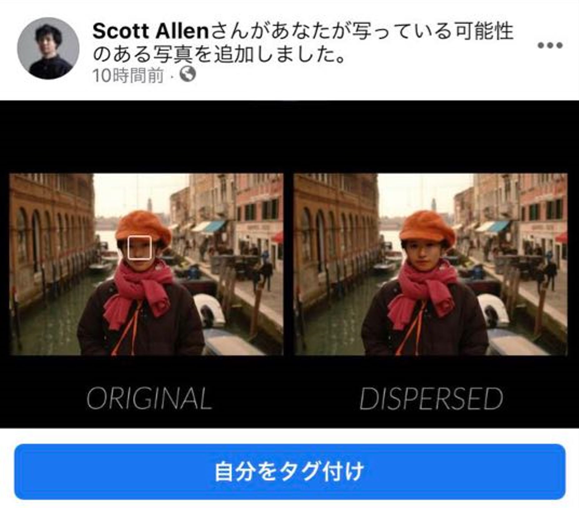 また、Facebookに元写真と本作品の組を投稿すると、前者だけ本人と認識されます。AIの識別モデルも欺くことができる点は高度なテクノロジーとの関係の築き方の手がかりを示唆します。 -