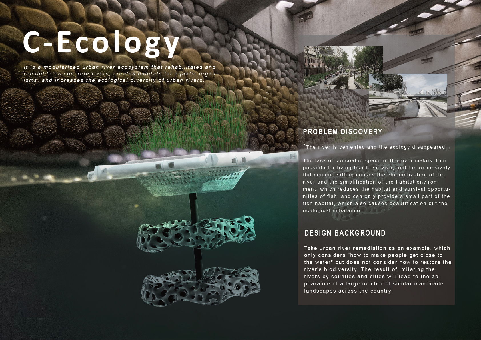 Through environmentally friendly ceramics , which re-created into a new ecosystem, combined with 3D printing technology. And through the modular structure, it can adapt to the size and depth of rivers in various regions. Place a wetland system on the resuscitation basket on the surface of the water to provide nutrients, and design a coral reef structure in the water to allow shrimp, shellfish and other organisms to have habitat, and at the same time increase the water circulation. Achieve a balance among the three aspects of hydrophilicity, environmental beautification and ecosystem in urban rivers.
