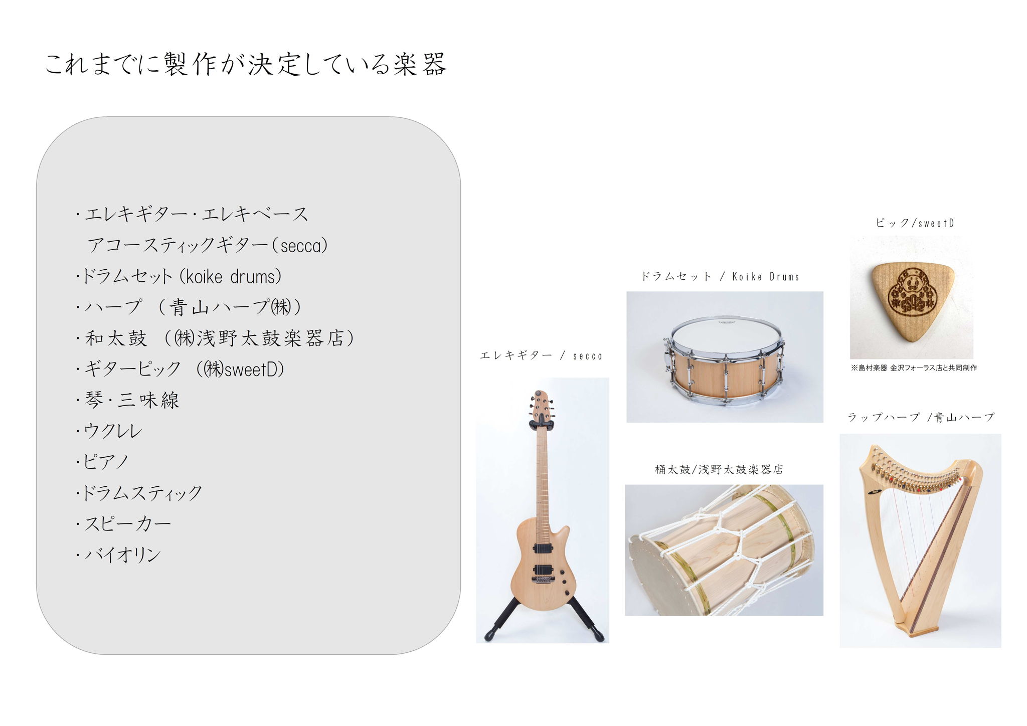 能登ヒバが有する耐湿、耐朽、芳香作用などの特性以外に音響特性に期待が高いこと、私たちの生活に身近で価値が持続するプロダクトの一つであり、元より自身が音楽好きであることから能登ヒバ楽器の製作にトライしこのプロジェクトがスタートし、今回のプロジェクトで選定した国産地域材である能登ヒバの素材特性の価値・可能性を見出す試みに様々な楽器メーカーがコラボレーションしています。