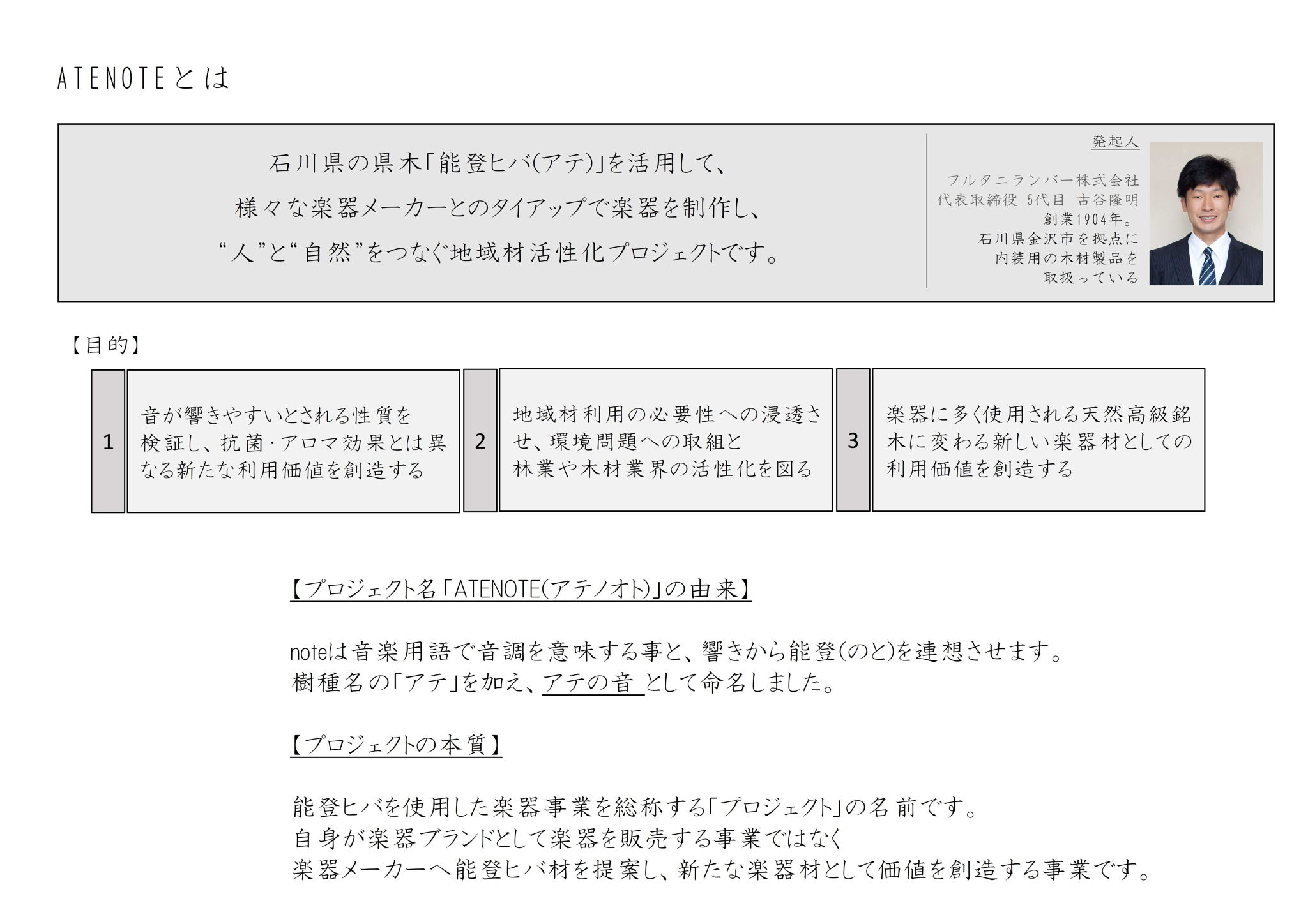 プロジェクト名は樹種の別名「アテ」と音楽用語で音調を意味し、また響きから能登も連想する「NOTE」を組み合わせATENOTE=アテの音と命名しました。
