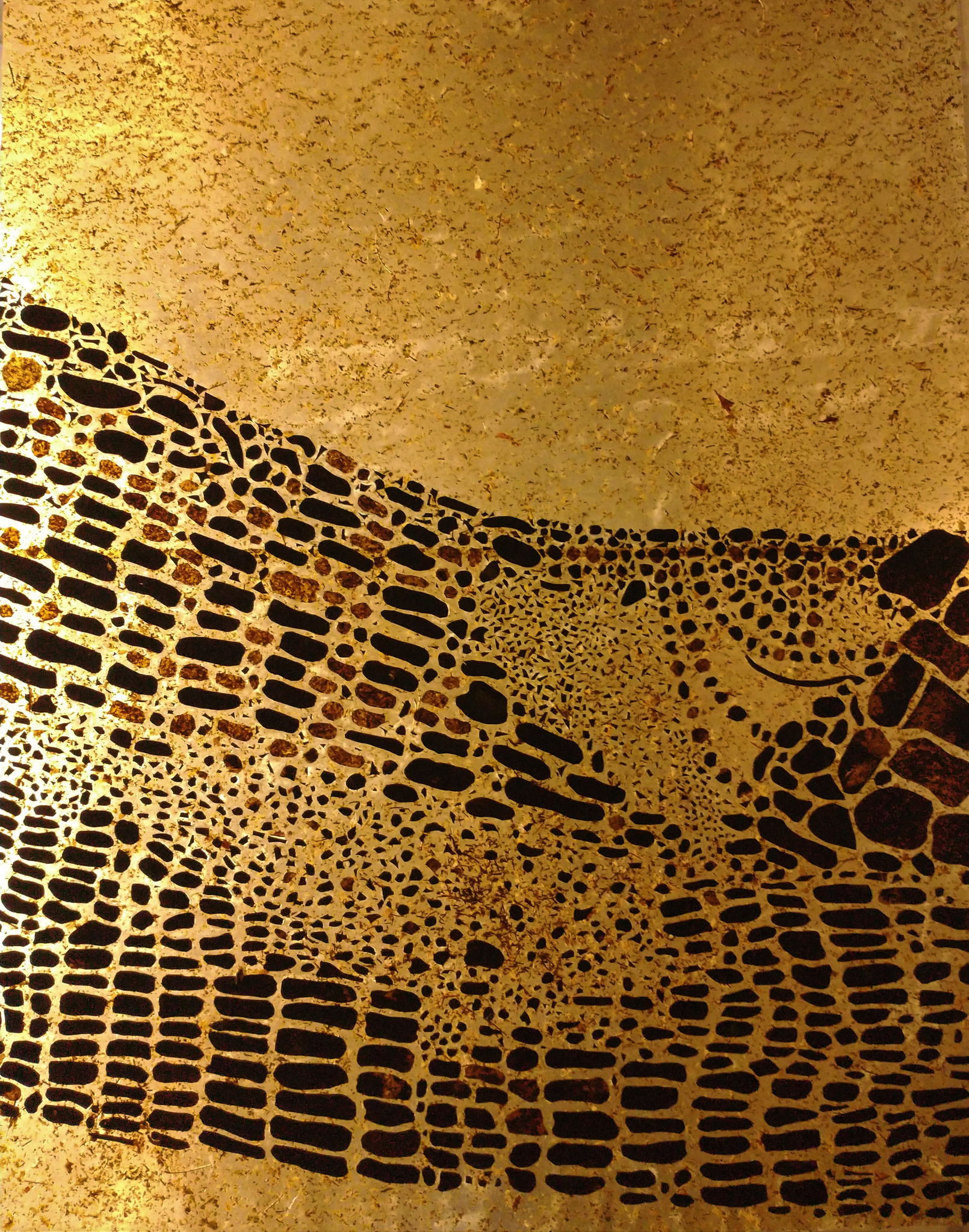 Ecdysis is the term that corresponds to the natural change that occurs periodically in the outermost layer of the epidermis in invertebrate animals during their growth. The vegan skin evokes, by means of vectors, the representation of an ancestral animal. This work takes us to the sensation of contact with the skin, recalling the transmutation of living organisms in the course of time. A bio textile construction that alludes to protection through its fibers; and also proposes a new use of biodegradable materials obtained from the processing of the Erythroxylum Coca plant. This millenary plant generates a multitude of meanings that can range from violence, politics, subway economy, skin, nature, landscape, ancestry, resistance and the conflicts derived from land tenure and exploitation.