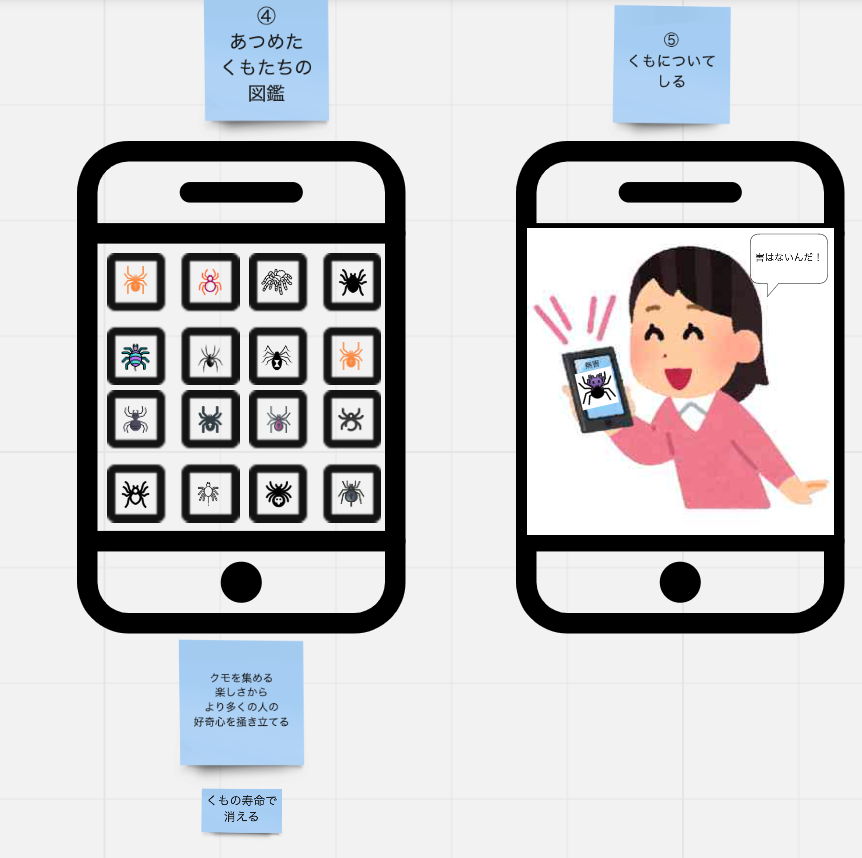 そこで私たちは、クモと共存をするために「My Spider」というアプリケーションを提案した。My Spiderを開発した理由は、クモについて知ること、人間に愛着を持たせることが目標で、もし家の中に出没したクモを見つけても、「あ、クモだ」と自然に溶け込むような姿勢になってほしいと考えたからだ。主な内容は、リアルで目視すると不気味なクモを、スマートフォンのカメラ機能を使って、クモの感情や言動を言語化し、アバターのような可愛いキャラクターにする機能である。家の中にいつどこに現れるかわからない不気味なクモも、写真を撮って、アバター化して、それを図鑑に登録できるようになれば、クモの特徴を学び、好奇心を持つことが出来る。そしてクモについて共感することができると考えた。