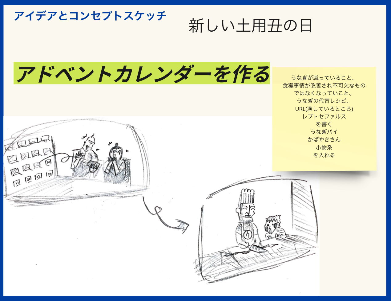 We propose to create an advent calendar for the Doyo no Ushi Day to approach the decline of unagi, environmental issues, food loss issues, and cultural aspects.