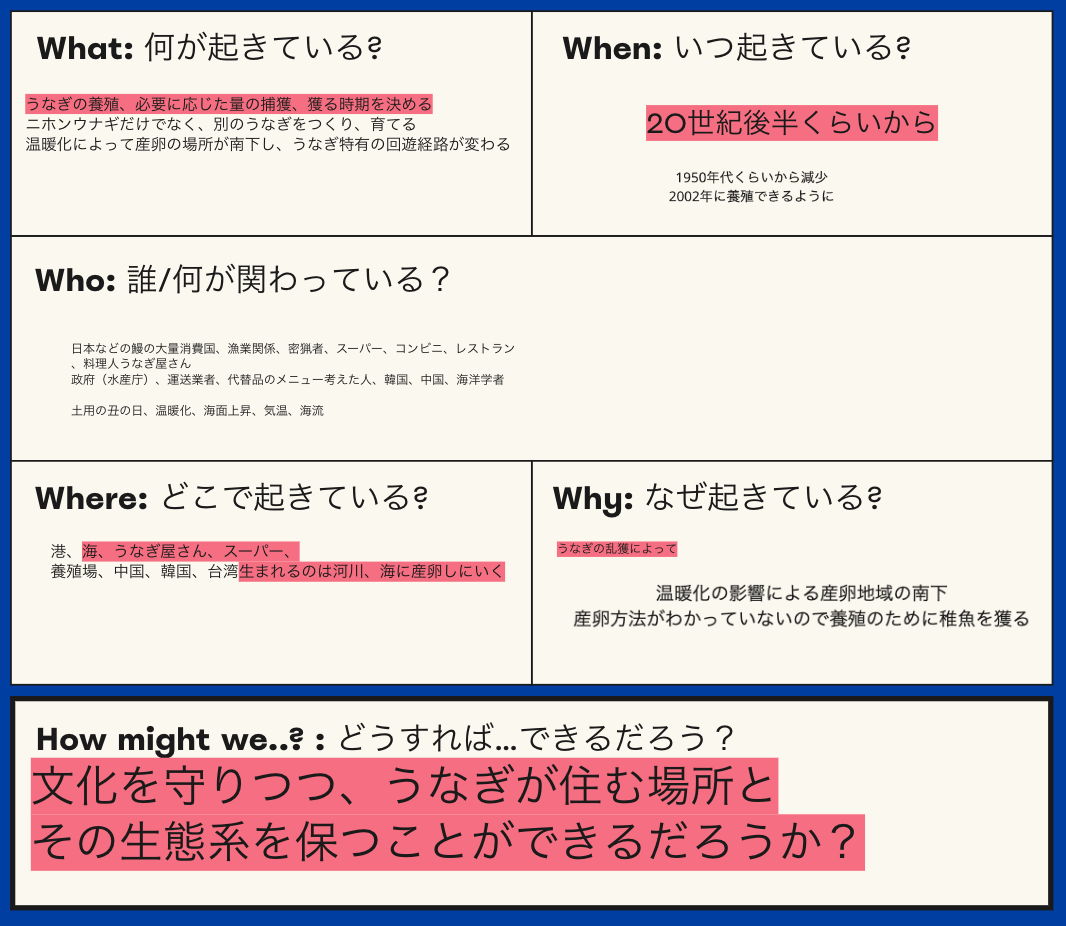 When we learned that Japanese eels were being overfished, we decided that we wanted to protect them. One reason they are being overfished is because in Japan, we have a culture tradition where eels are eaten as a way to celebrate the Day of the Ox. We were surprised to learn that some of the overfished eels are caught by poachers and that we may be eating these insustainably poached eels. We also felt that the disappearance of eels, which stand at the top of the ecological pyramid, may have an impact on the overall ecosystem.