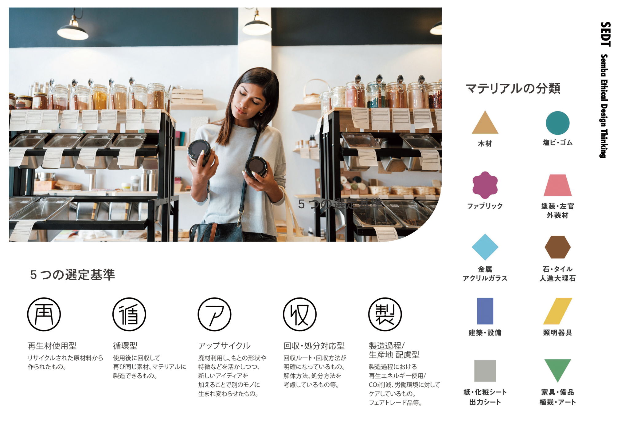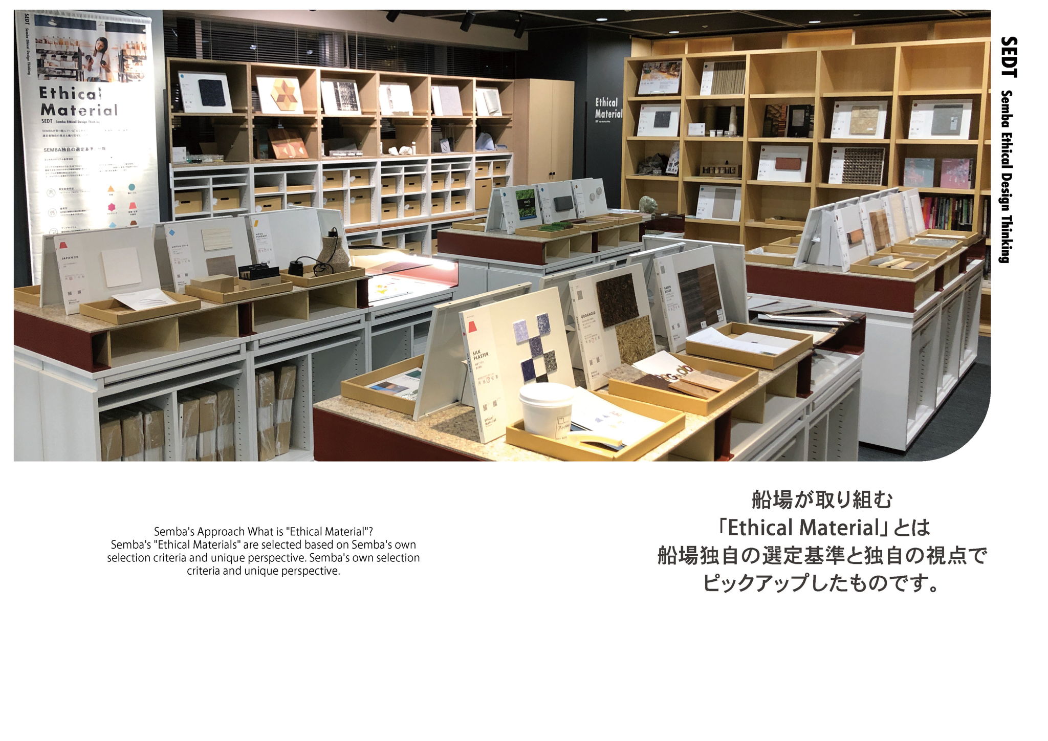 Semba Ethical Design Thinking (SEDT) is Semba's own selection criteria and unique perspective. In commercial spaces, where the life cycle is much faster than in other fields, Semba has started an initiative to change the way we select materials, aiming to "create spaces that think about what happens after they are made. The first step is to change the way we select materials. In the past, we selected materials based on function and design, but now we are learning about raw materials, production methods, and recycling so that we can select and use materials that promote resource recycling. In the future, I would like to not only create awareness within the company, but also play a role as a platform where information from inside and outside the company can be gathered and shared, leading to the creation of resource-recycling spaces. -