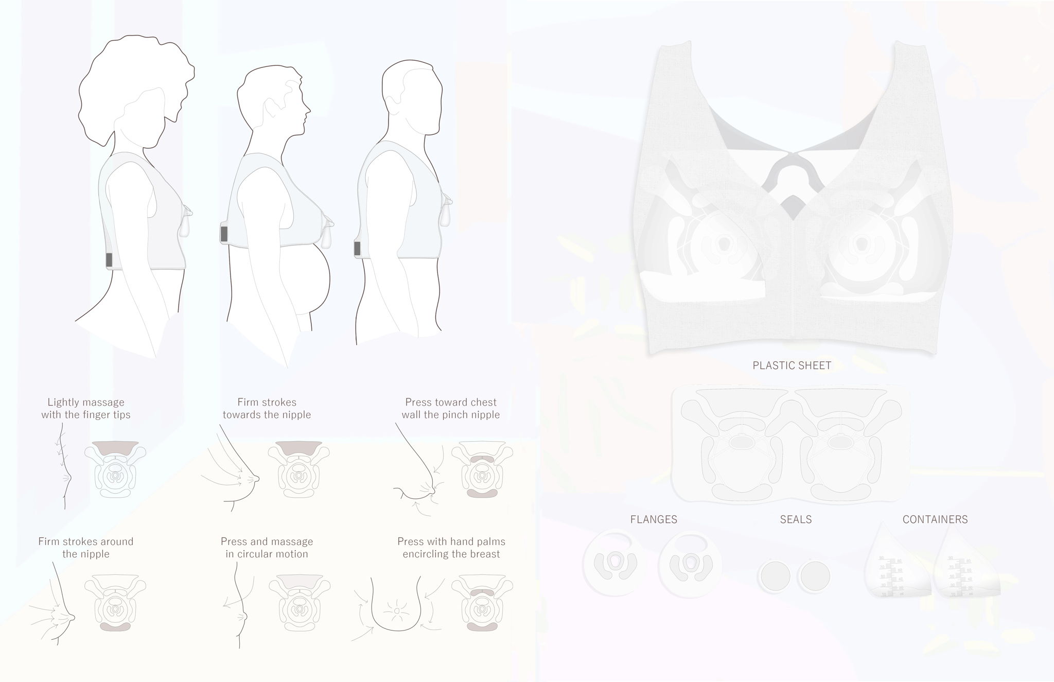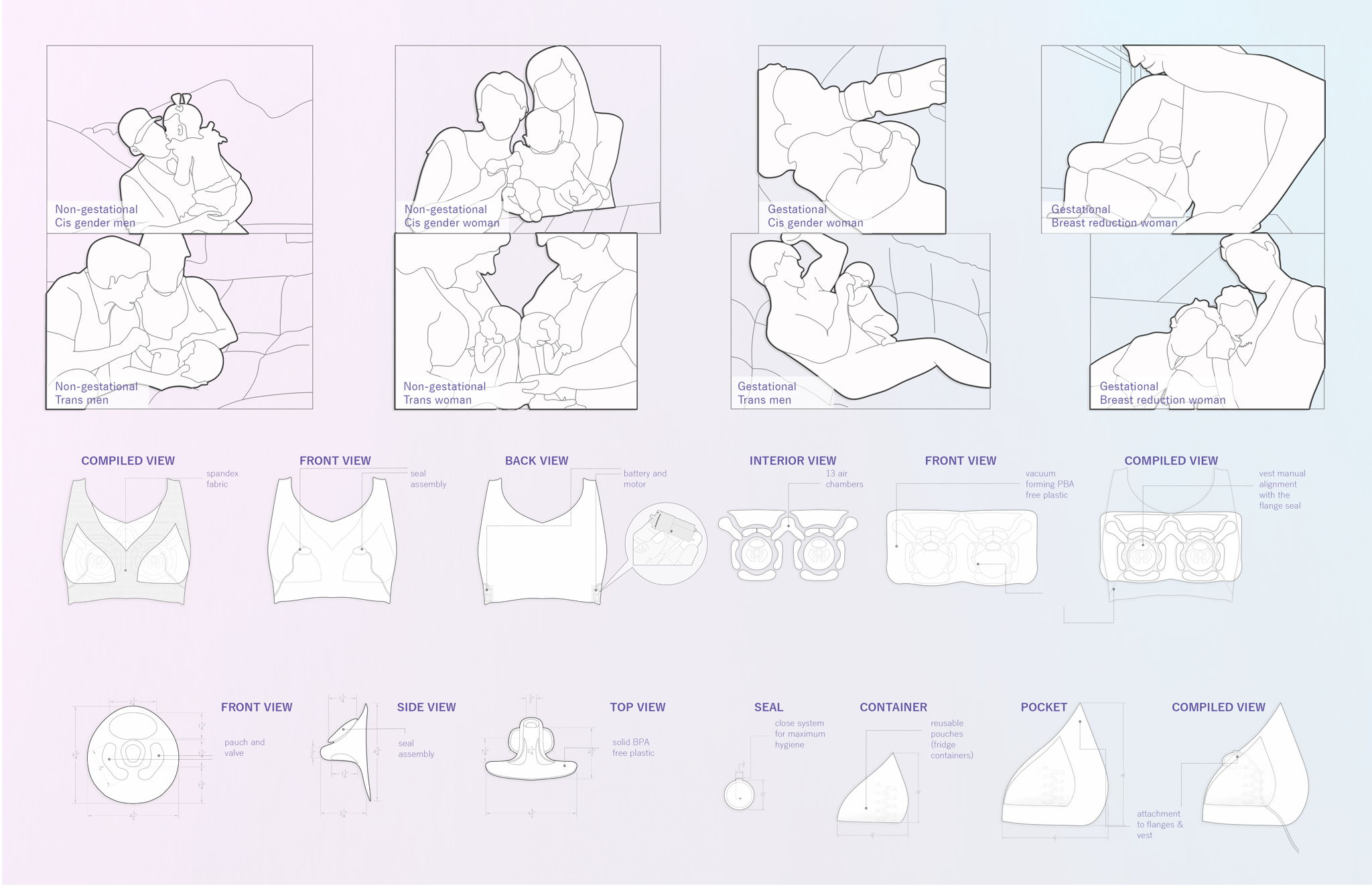 It has been found that there is a healing component to breast/chestfeeding that can help heal the heartache of infertility. However, the amount of milk produced when inducing lactation can vary widely and some people will make a partial milk supply. Future considerations will be to explore an alternative even if no milk is produced at all, through a nursing supplement that can be incorporated into the milk containers as a tiny feeding tube that carries the milk to the nipple. And also exploring materiality and aesthetics for potentially building a second version and improved prototype. -