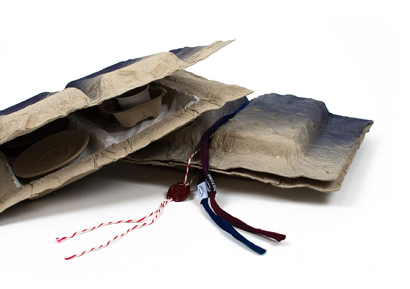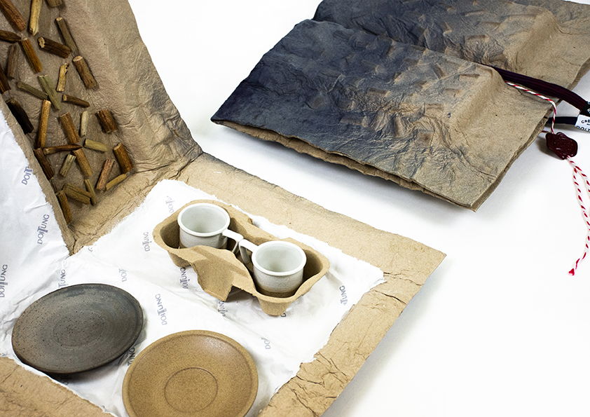 Re-Krafts x Re-Hyacinths gift box packaging turns the aesthetic of cushioning material inside out. By mixing the leftover paper scrap, cardboards box with mulberry pulp. Water Hyacinth packaging offers a sustainable alternative to the future of packaging design. The Water Hyacinth is inserted between layers in order to minimize the use in large quantities. This biodegradable packaging is made possible by the process of spooning paper onto a ceramic mold. Each box comes with an Espresso Gift set, while we encourage the user to reuse this versatile packaging for other uses in the future.