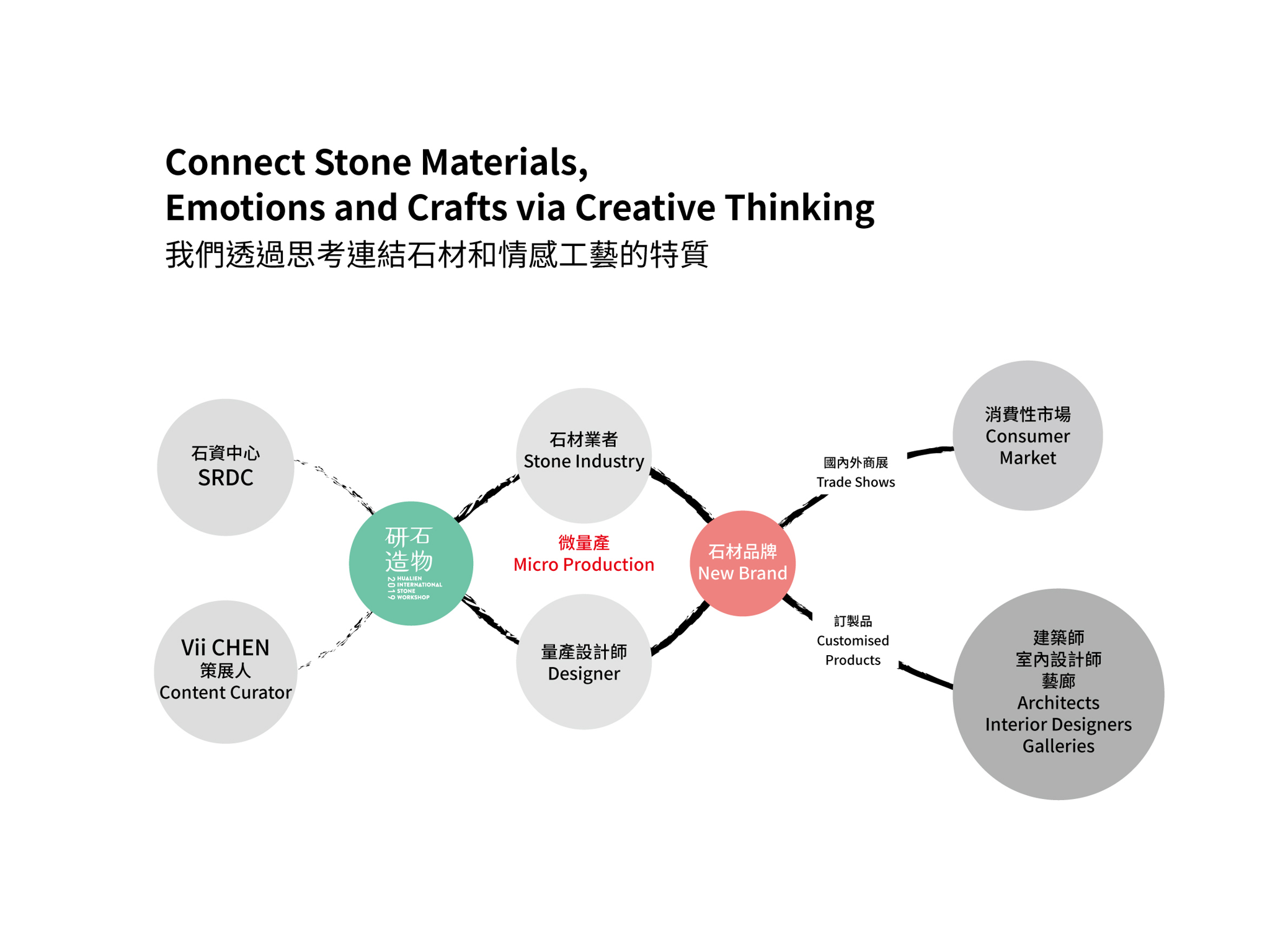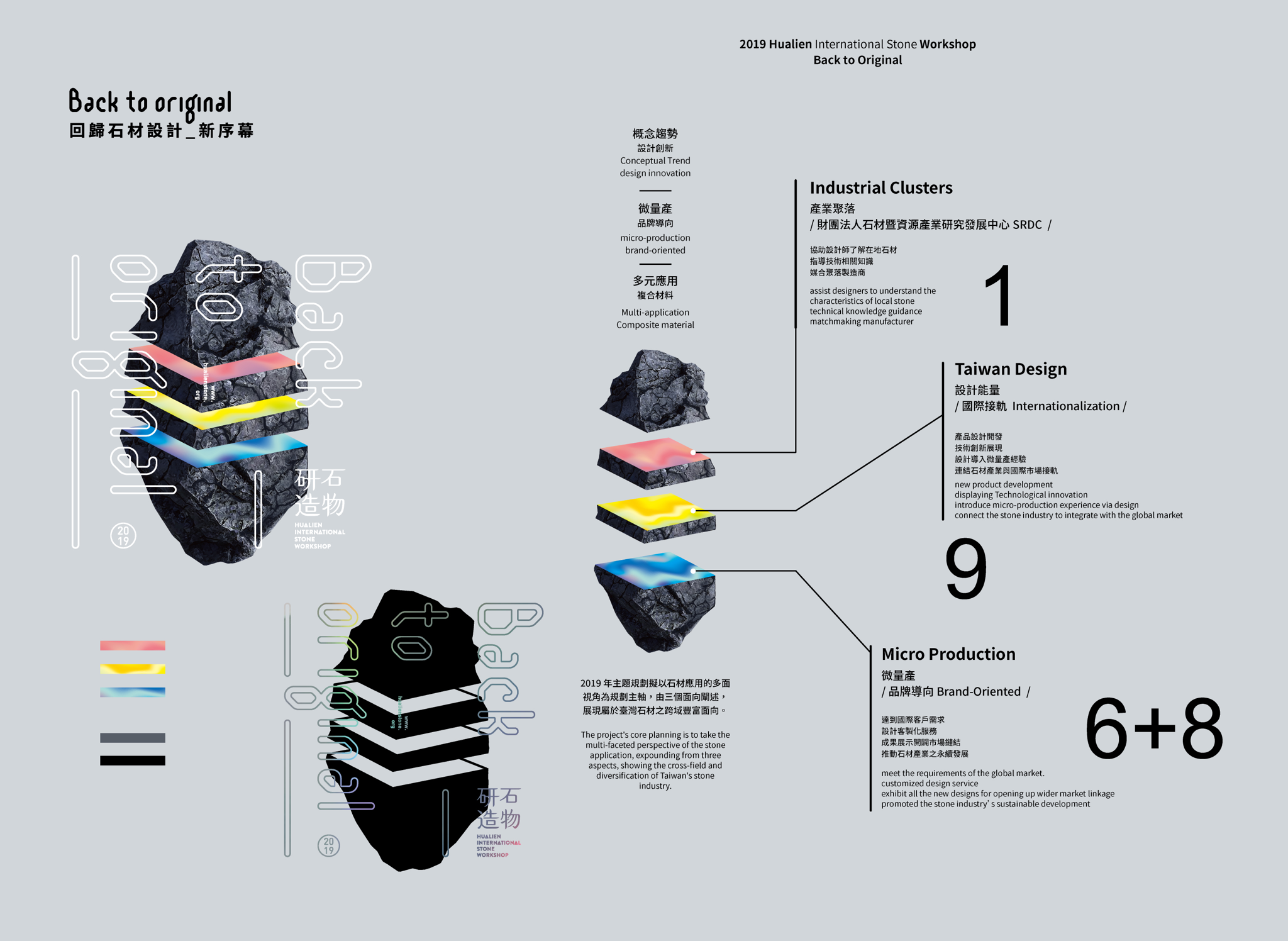 The entire program puts cultural and technological strengths together and brings the focus back to the original values of the raw materials. Designers with experiences in mass production joined forces with stone manufacturers, utilizing the idea of “Micro Production” between customization and mass production and therefore taking Taiwan into a new “stone brand generation”. Taiwan's stone brands will be able to exhibit the width and depth of their energies, extend their design capacities, and promoting them to collaborate with diverse global industries in terms form a positive cycle for the industry chain.