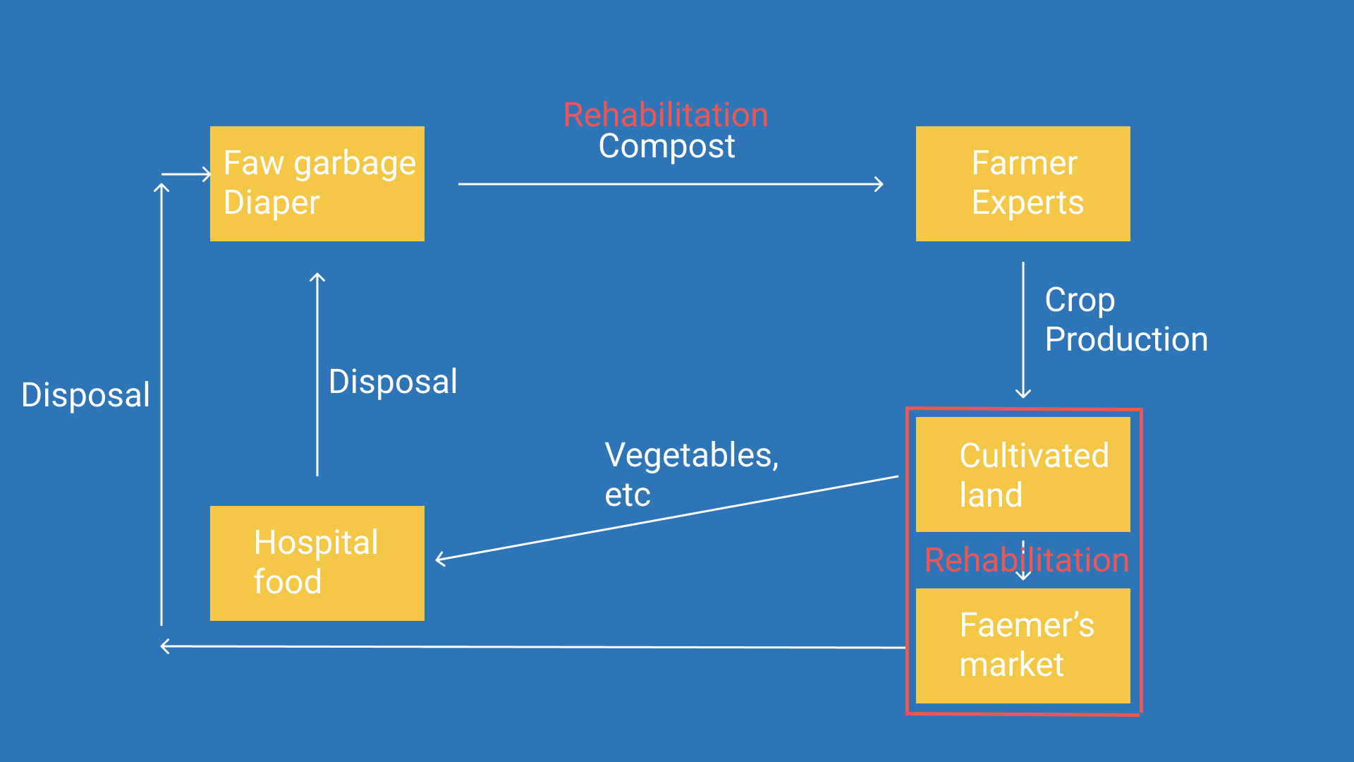 ・Specifically, as a rehabilitation practice, compost will be prepared from the hospital's kitchen waste and disposable diapers and used by local farmers. In return, they will grow crops jointly with the farmers, use them for hospital food, and hold farmers' markets on the hospital grounds.
