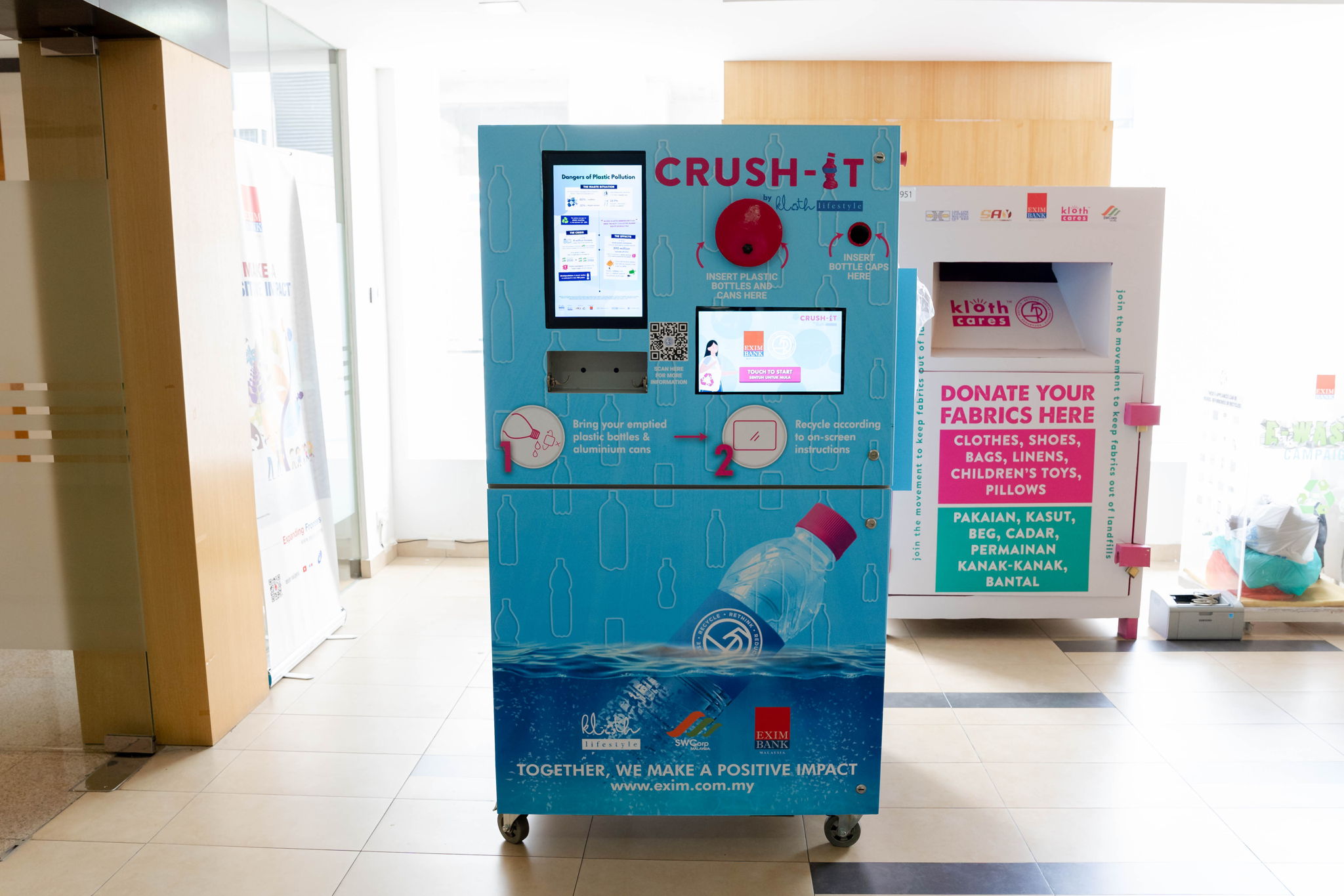 Extending its corporate social consciousness from fabric recycling to include plastics as well, EXIM Bank Malaysia became the first financial institution to join the Kloth Circular Plastic Recycling Movement (KCPRM) and adopt the disruptive Reverse Vending Machine (RVM), also known as Crush-It by Kloth Lifestyle.