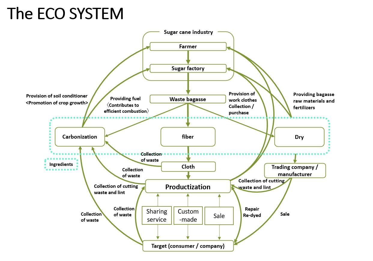 Today's business travelers and tourists buy Kariyushi shirts to wear during their stay in Okinawa. Since then, many have been discarded. We aim to enable Kariyushi Shirts to be used in a way that is as lean as possible and does not burden the environment. Kariyushi Shirt, which has been used for sharing a certain number of times, is carbonized in a coal-making furnace and used as a soil conditioner for sugar cane fields. As a result, a circulation structure centered on sugar cane was constructed. In addition, Okinawa's traditional craft "Ryukyu Bingata" and modern art are used for textile design to improve Okinawanness and brand value. Finally, by embedding an IC tag for each item, you can visualize and trace the movement on the value chain as a Product Passport. We connect with craftsmen in the supply chain and users who share the same clothing, and provide more fun than just “wearing clothes”. -