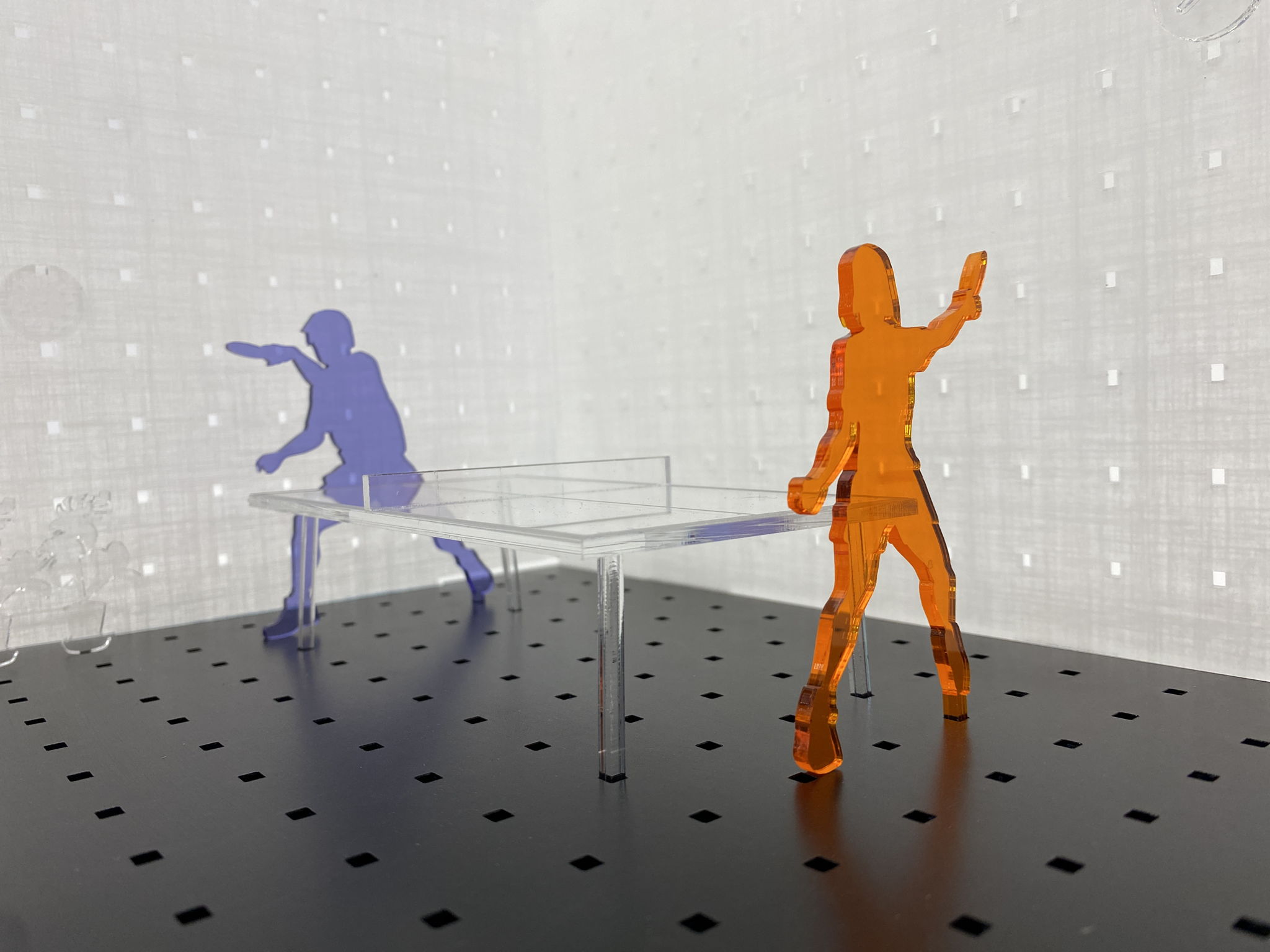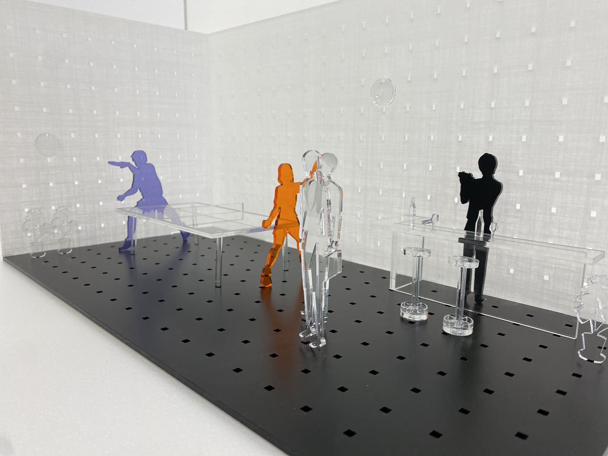 机や椅子、バーカウンターや卓球台が並び、人と人が笑顔でコミュニケーションのとれる部屋。ただし、そこに存在するものすべて使用済みのアクリルパーテーションを材料に再構築した透明なオブジェクト。