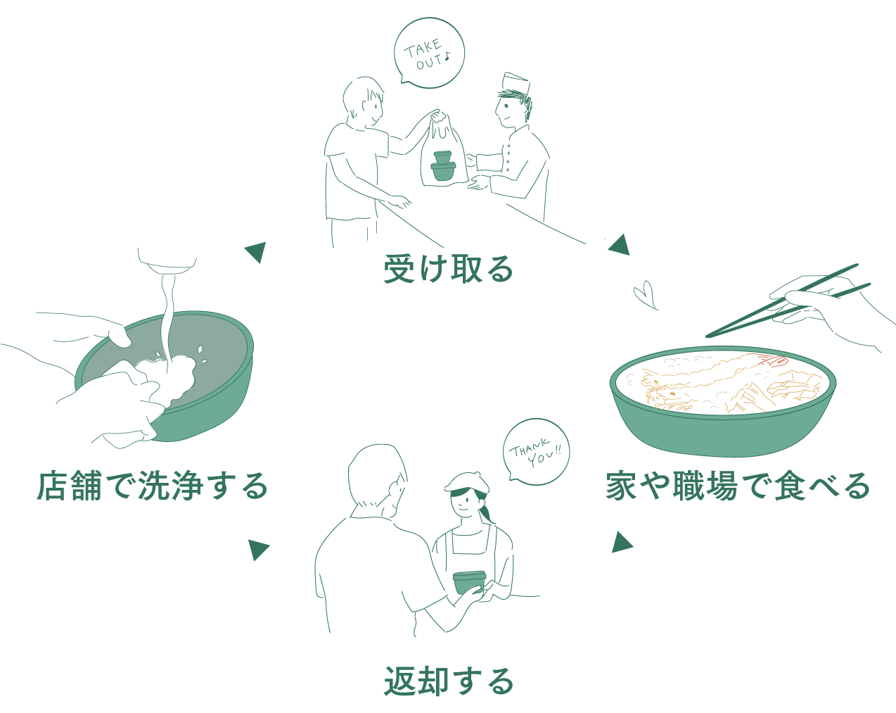 そこで、街共通のリユース容器でテイクアウトし、容器ゴミを削減します。