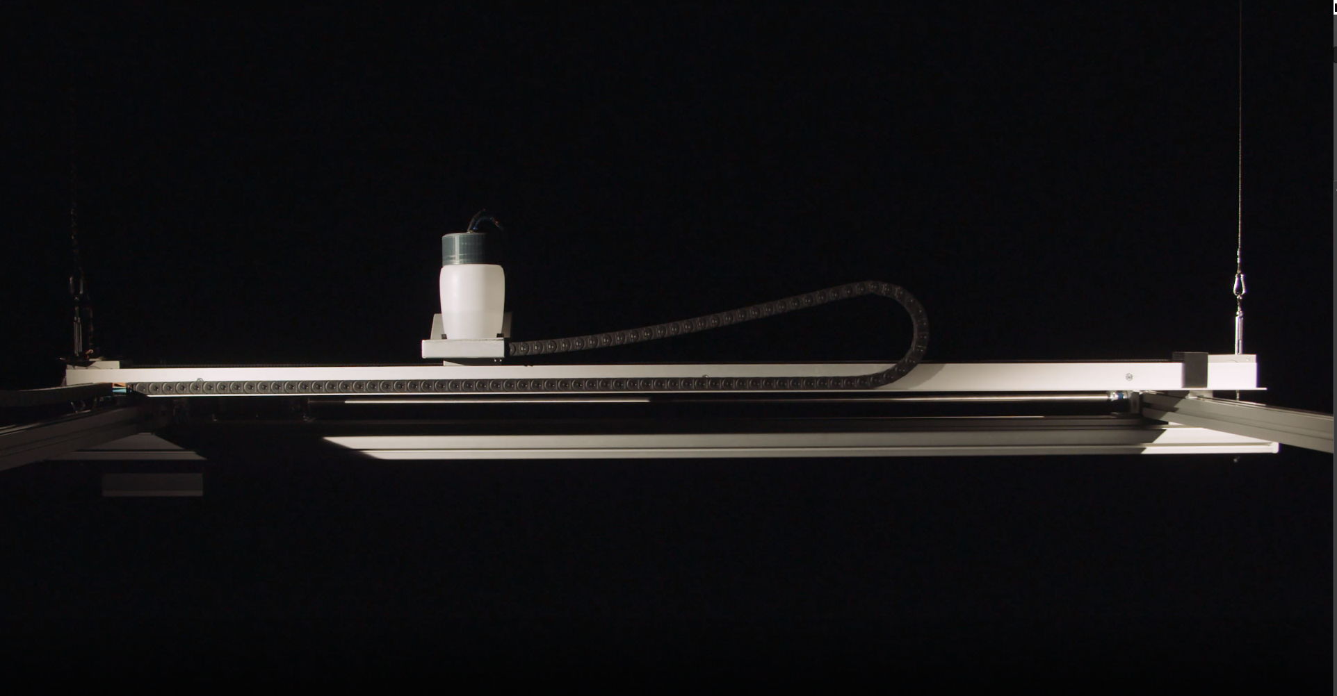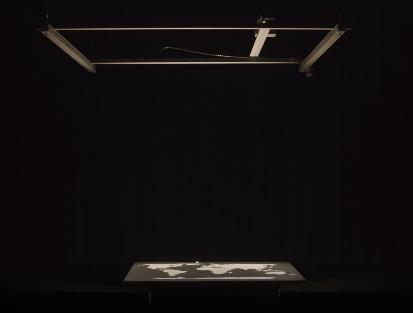 The platform with the world map is made of black wood and measures 1.6m by 1.3m and is 40cm high. At a height of about 2.5m, suspended from steel cables, there is an axial linear guidance system made of aluminum above it. The weather data is obtained live from the website openweathermap and processed with the help of a Raspberry Pi which needs a WiFi network.