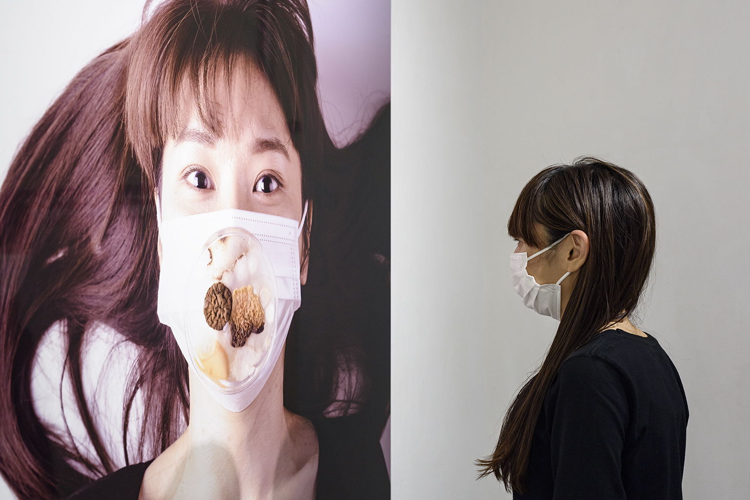 マスクの上の微生物に着目し、眼に見えないものが生き続ける奇妙な存在を表現することで、