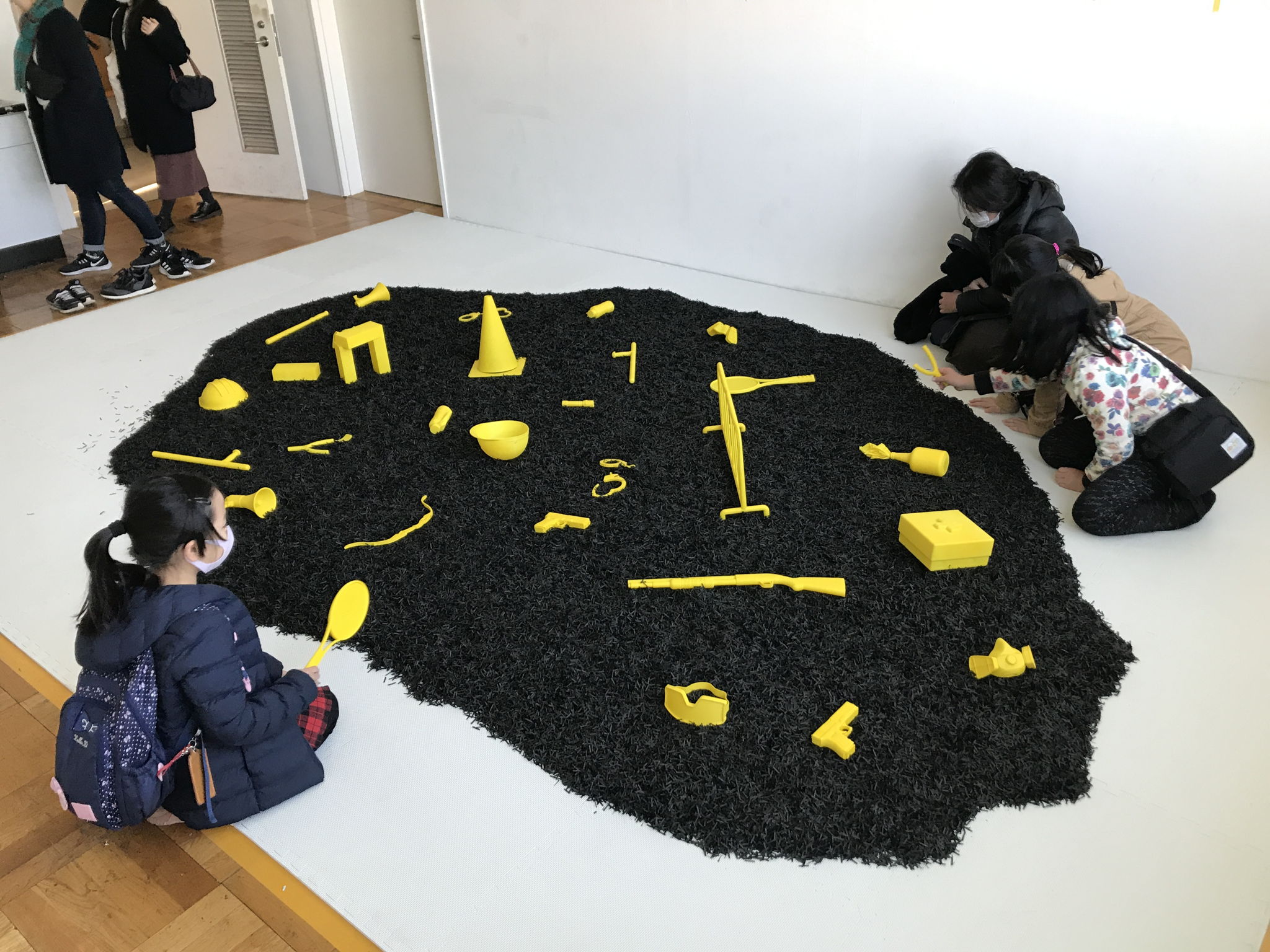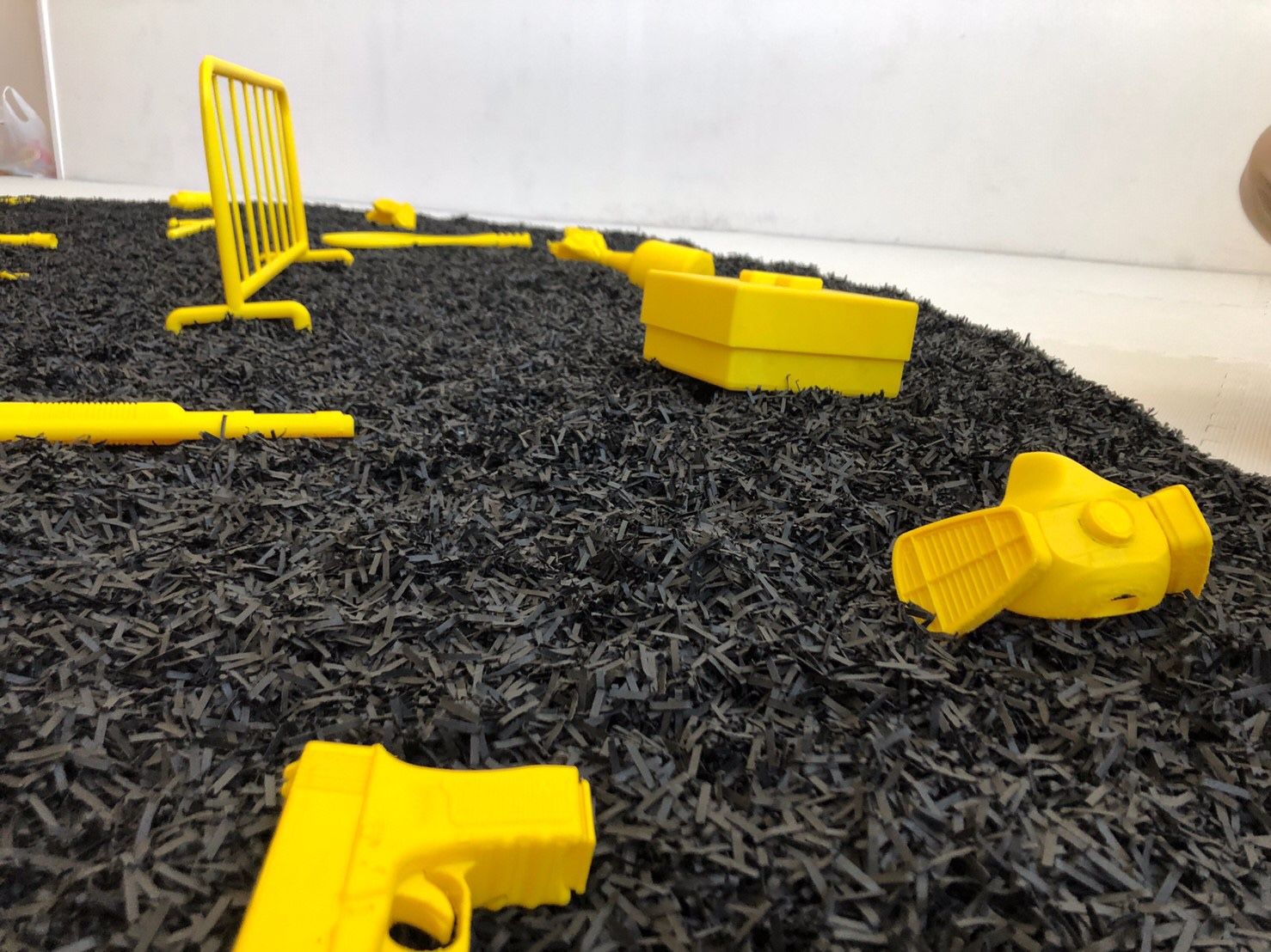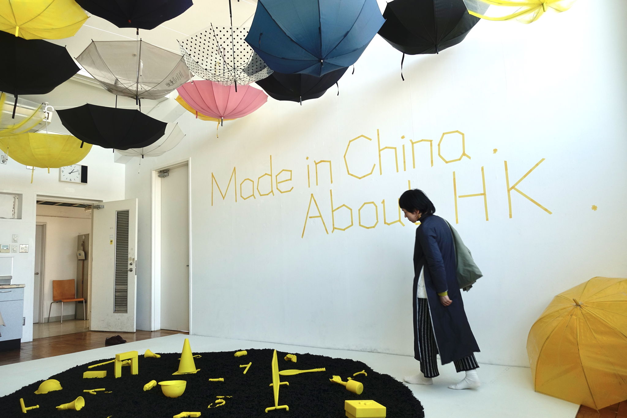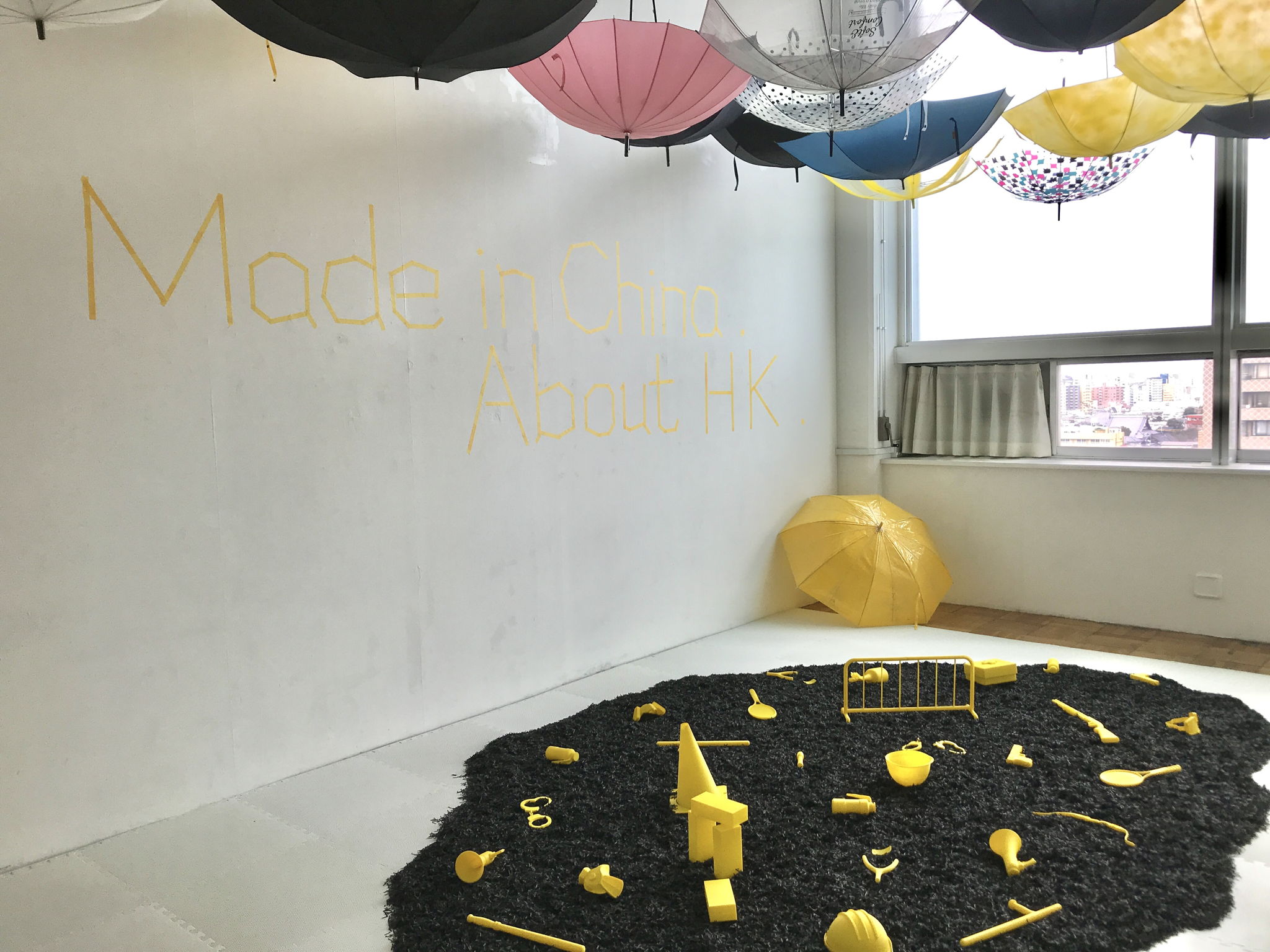 started to make this work preparations in August 2019. At the beginning, I just had an idea about the Hong Kong repatriation incident that happened in June at that time. Events are brewing. On the Internet, major media platforms are constantly reporting related matters. And I follow some friends in Hong Kong and Taiwan, and they often discuss what is happening in Hong Kong, and share pictures and videos. So I began to make a plan in September 2019. After that, I contacted a 3D printing company in mainland China, and then agreed on the production price, the material and size of the work. With all of these yellow splashes, they lose and destroy the functionality of each object through 3D printing. It turns into a symbol. These symbols not only represent what is happening in Hong Kong, including guns, tear gas, handcuffs and gas masks, but also cover the issues of gun sensitivity, terrorism and human rights persecution that exist around the world today. And in China, many activists are arrested and imprisoned every year. I commissioned the 3D printing company in China to make it, and I also wanted to convey the dependence of commodity production worldwide on the Chinese market and Chinese manufacturing today. The irony, then, is that China's authoritarian society has also created a crisis of universal values around the world. Like the Hong Kong problem, it's made in China. I was born in China, and as a Chinese identity, I used a Chinese factory to make a theme about Hong Kong, which was presented in Tokyo, and what that means is today's complex relationship between identity, international and venue.