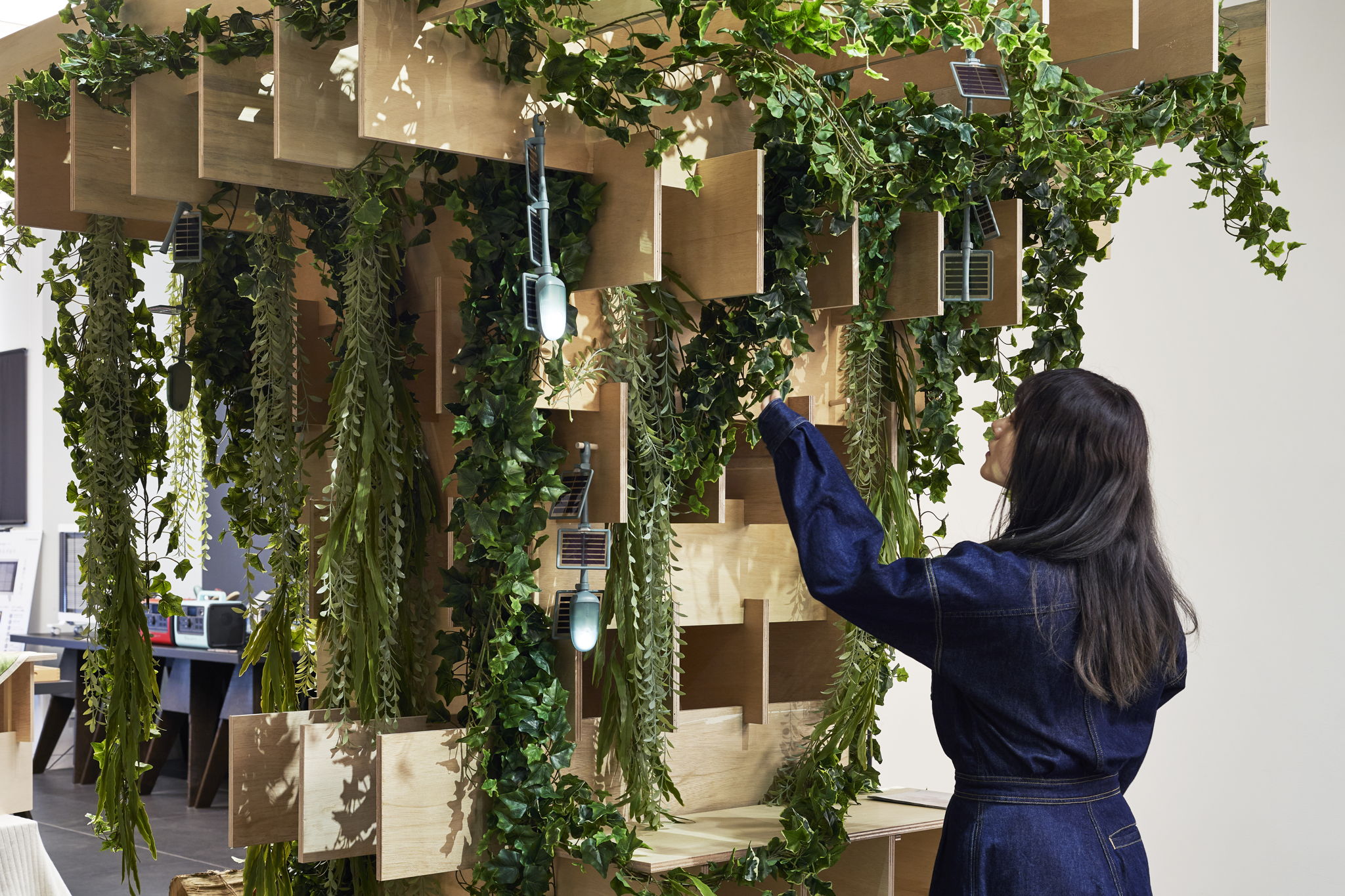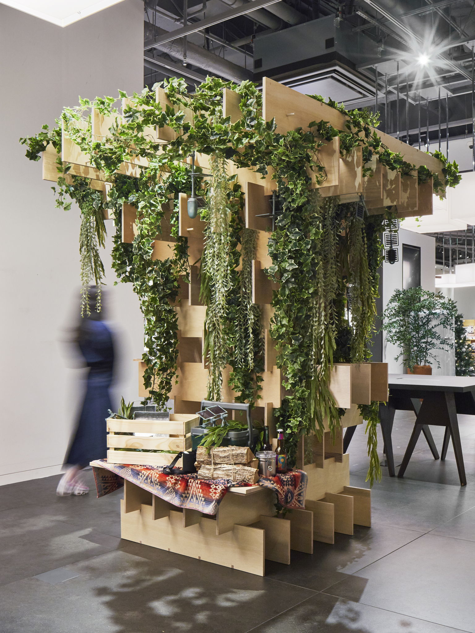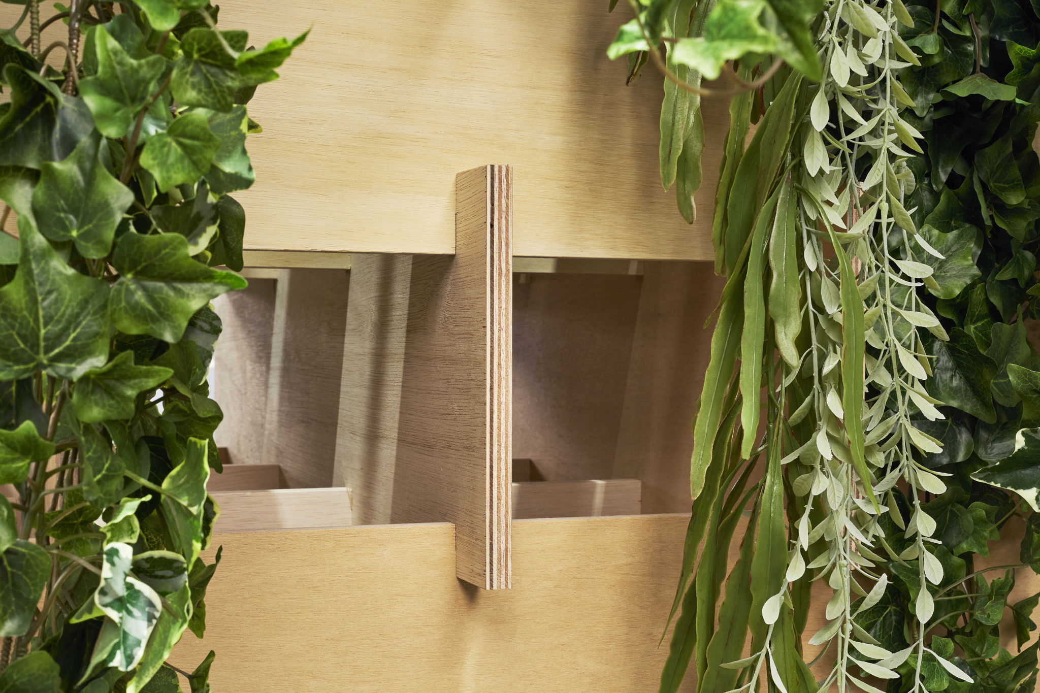 白色のラワン合板を用い、幅1024mmから2362mm、高さ225mmのエレメントをくみ上げている。仕上げはせず、ラフさを許容することで、メンテナンス不要のレプリカのアイビーがそれとなく、装飾感をもたらすと考えた。