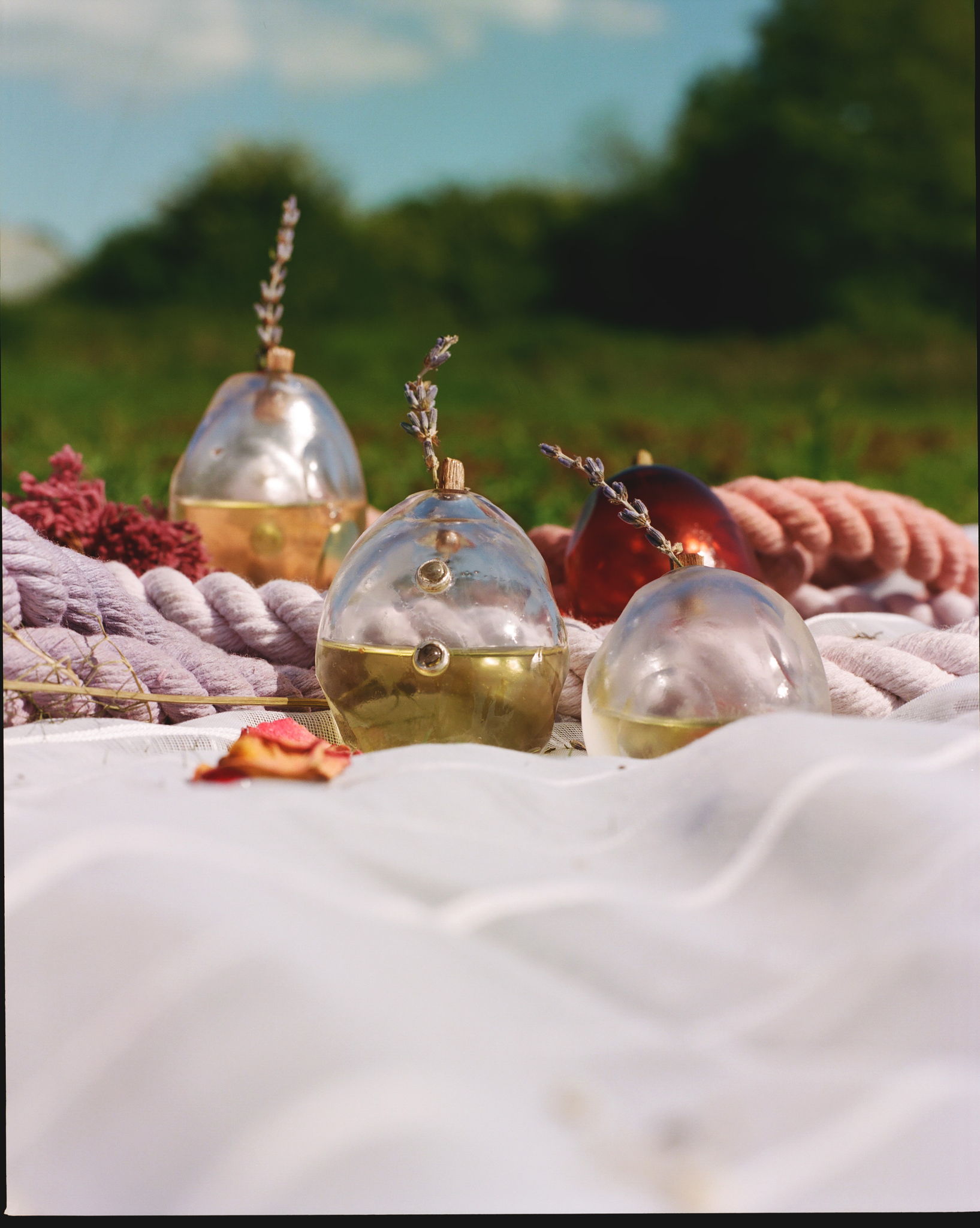 Four glass blown bubbles, designed to curve perfectly into a woman’s hand, each vessel around 8cm x 6cm. The vessels curve at varying degrees towards the stomach and back with indentations of around 2.5cm x 1cm cut into the glass to suggest grips for massage. Inserted into the glass are 0.5cm hand cast silver cups holding glass rollerballs which softly glide over the skin allowing for a small release of herbal oil. Naturally sourced lavender oil fills the containers. The top is stoppered with hand carved wooden plugs and sprigs of home-grown lavender.