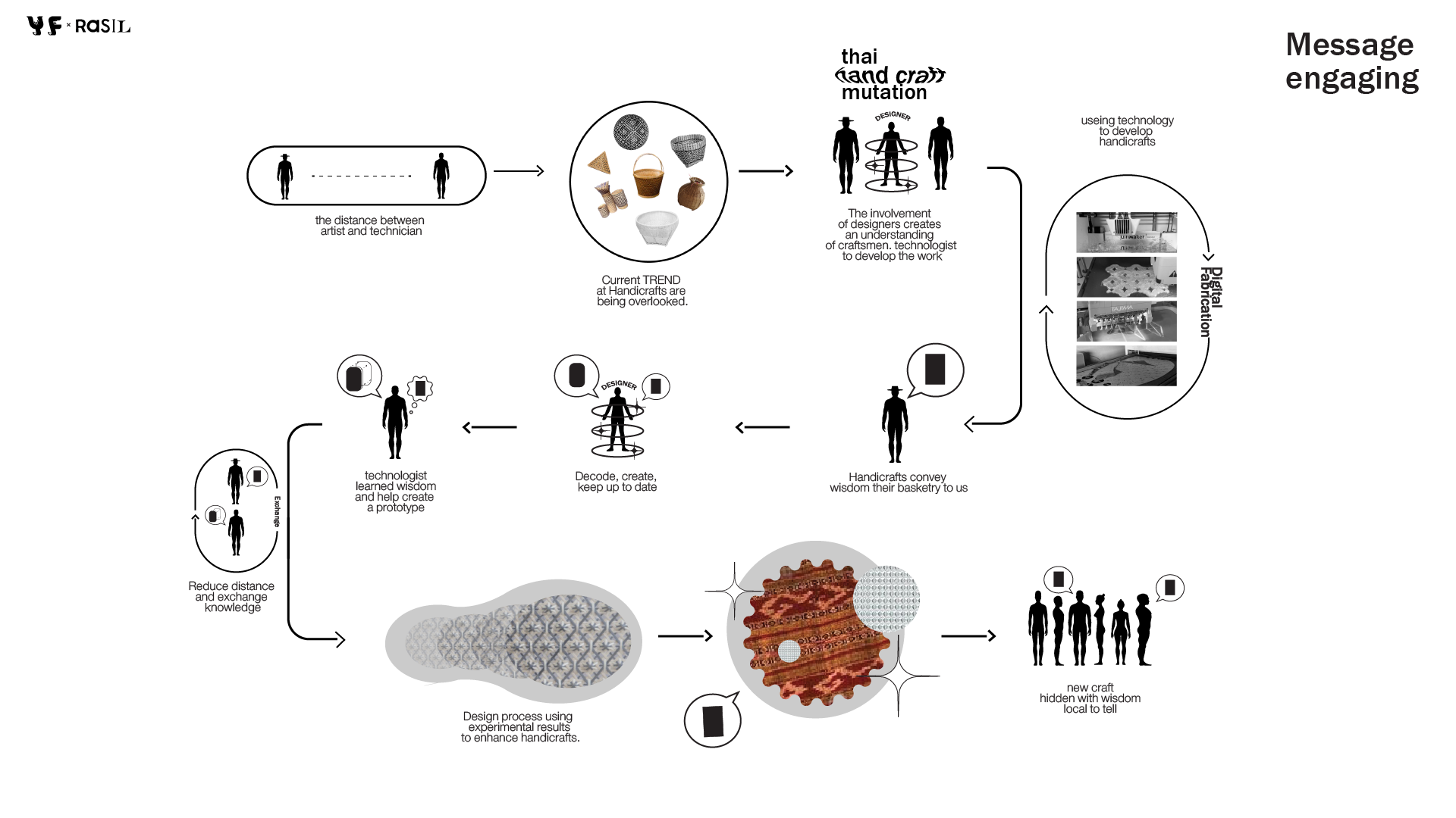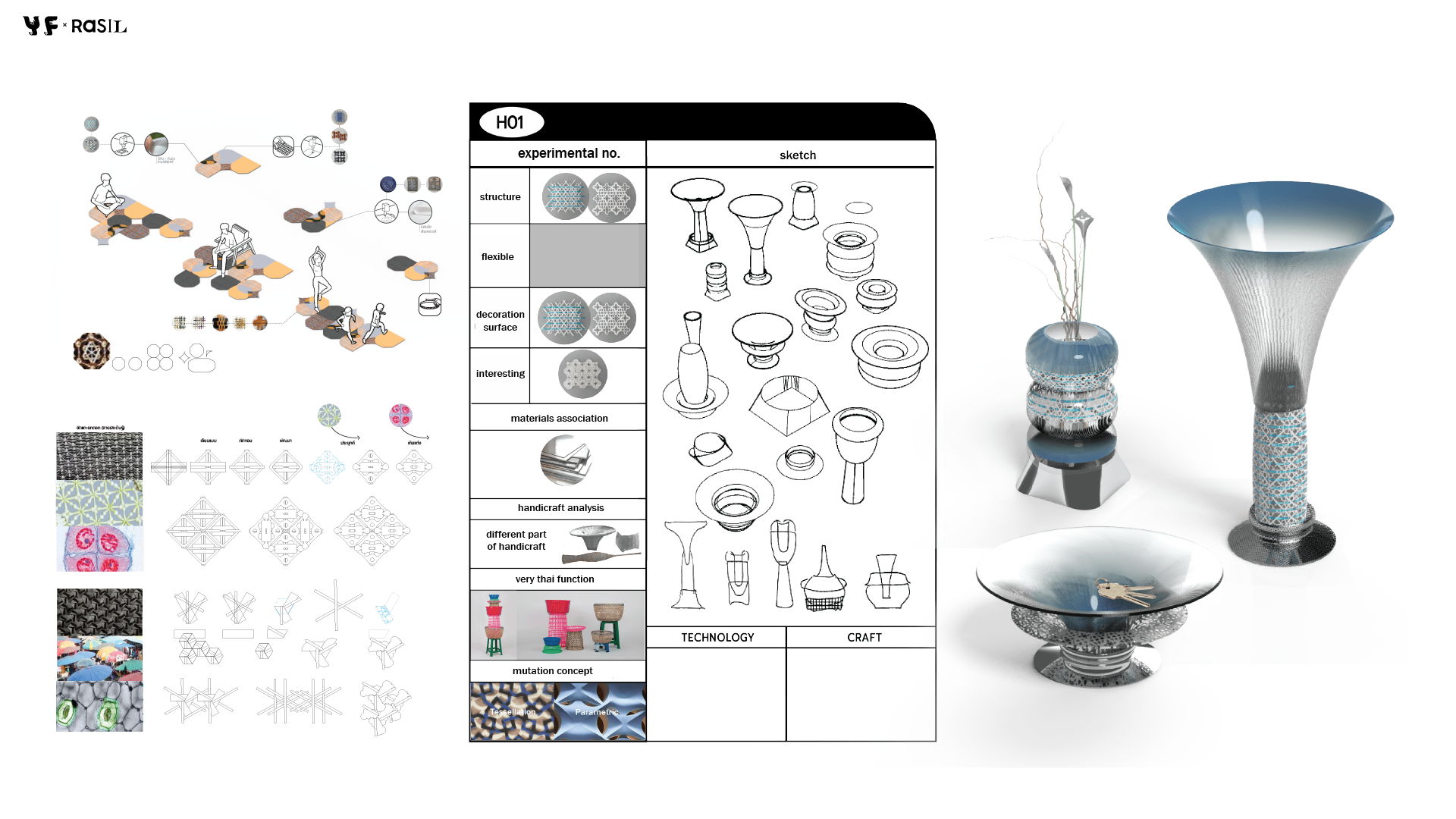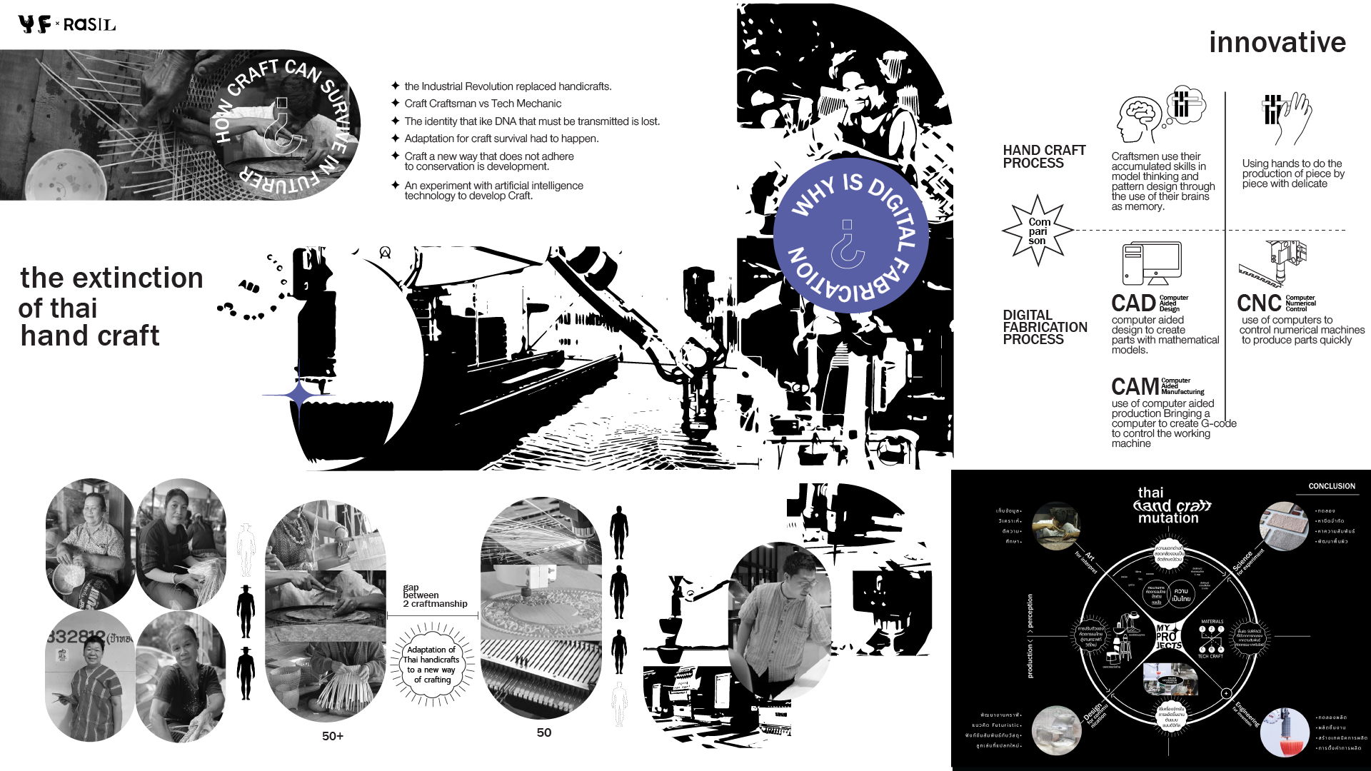 The development of technology comes at the expense of the missing human root wisdom. Handicrafts are considered as one of wisdom as well. When craftsmen view those technologies as enemies and far-flung things. Those roots will be faded. The aforementioned work is an experiment that combines digital production technology to develop alongside local handicrafts.Through the analysis of the properties of the basketry, the Thainess presents survival through mutational struggles of cells. Presenting a new, non-elevating perspective It is a human struggle to creatively combine handicraft with machine work.