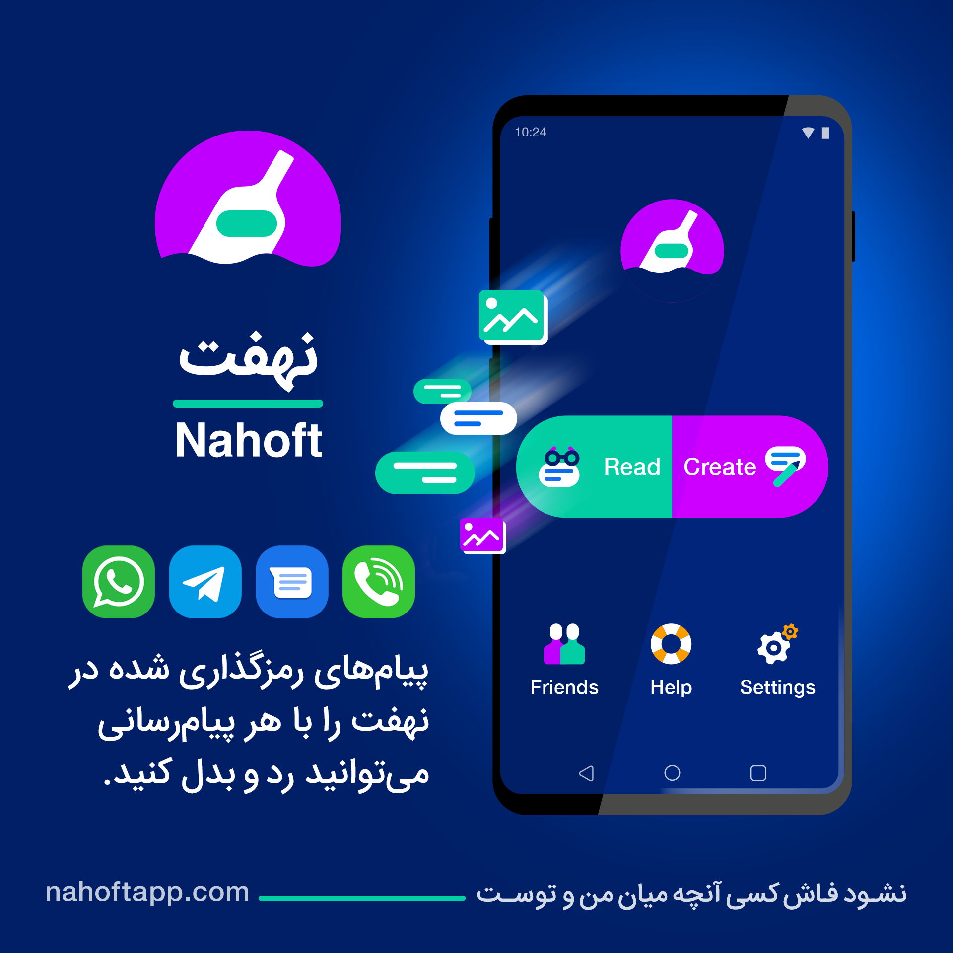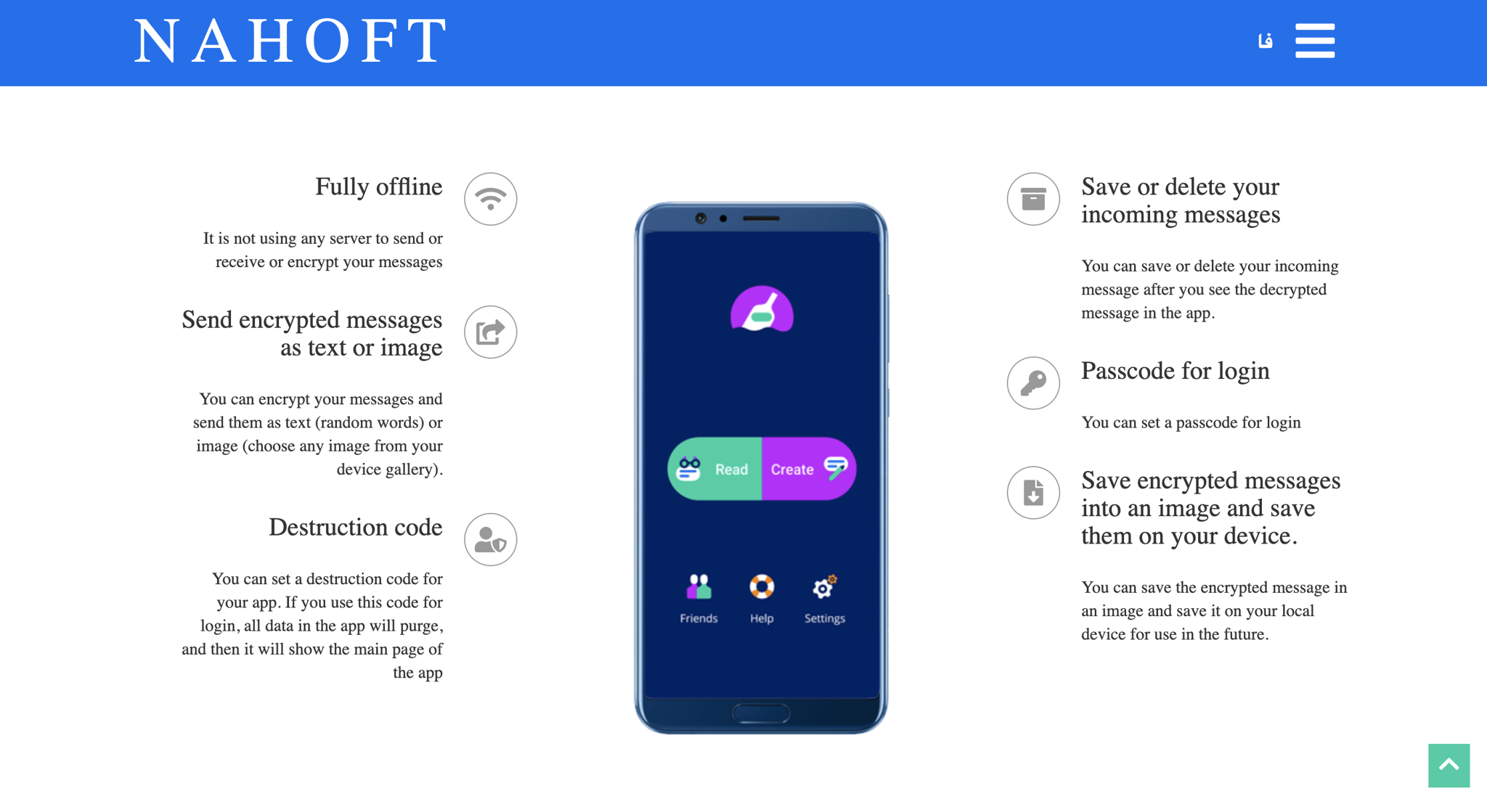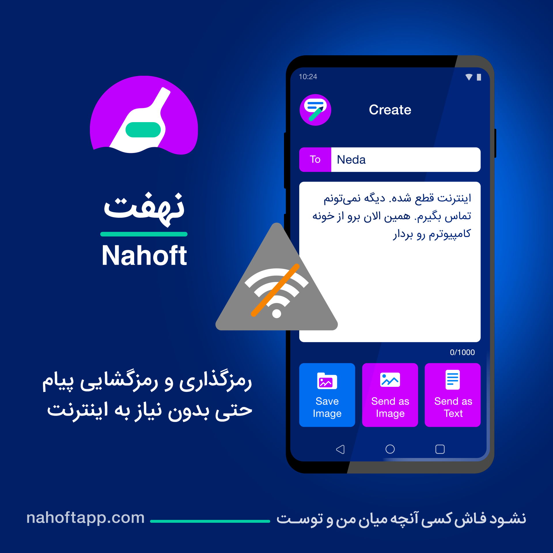 Nahoft is a mobile phone app made for Android phones. It allows you to encrypt any text message under 1,000 characters on your mobile phone before sharing it with someone they trust. You can encrypt your text message as a photo (known as steganography) or as a text message that uses a series of common and innocuous Persian words. Both encryption methods are secure and use bespoke technology and state-of-the-art encryption libraries (Sodium) that have been custom created for Nahoft.