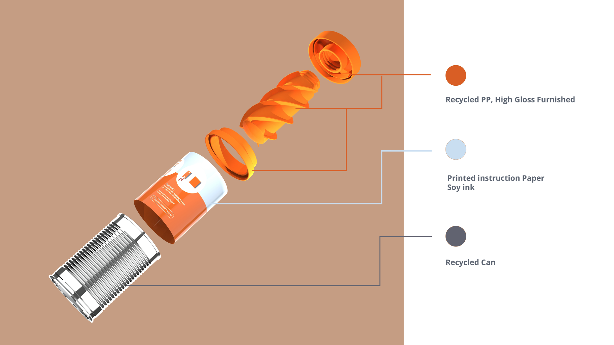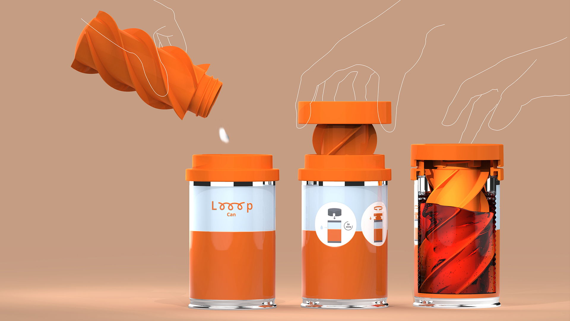 Instead of completely creating a new kit out of the sketch, Looop Can recycle the steel can into the design process so that users can replace their can if they found the old one starting to rust or be damaged. Not only does it reduce the cost but also allows the recycling of food cans without using up energy to melt them into a new can. Looop Can collaborate with the local manufacturer to build the recycling system for repurposing food can to ensure it is sourced locally which reduces the transportation fee. Most modern steel cans for food are given a hermetic plastic coating on the interior, which is used to protect the content from damage such as scratches or dents. Unless the user exposes the unprotected steel by melting or vaporizing the plastic coating with heat, the opened cans will not quickly develop a metallic rust smell. But it is still unable to resist the corrosion since the presence of oxygen: the food can oxidize and leave exposed steel which allows rust to form. Even with a hermetic plastic coating applied in food cans, Looop suggests users replace their can every 9 months for health and safety reasons. Since a food can is recyclable and has a standard size, the user should not struggle for replacement once the food can rust. For the rest of the part, recycled pp is used which is a highly versatile and chemical resistance material that aims to have a 30 years lifespan.