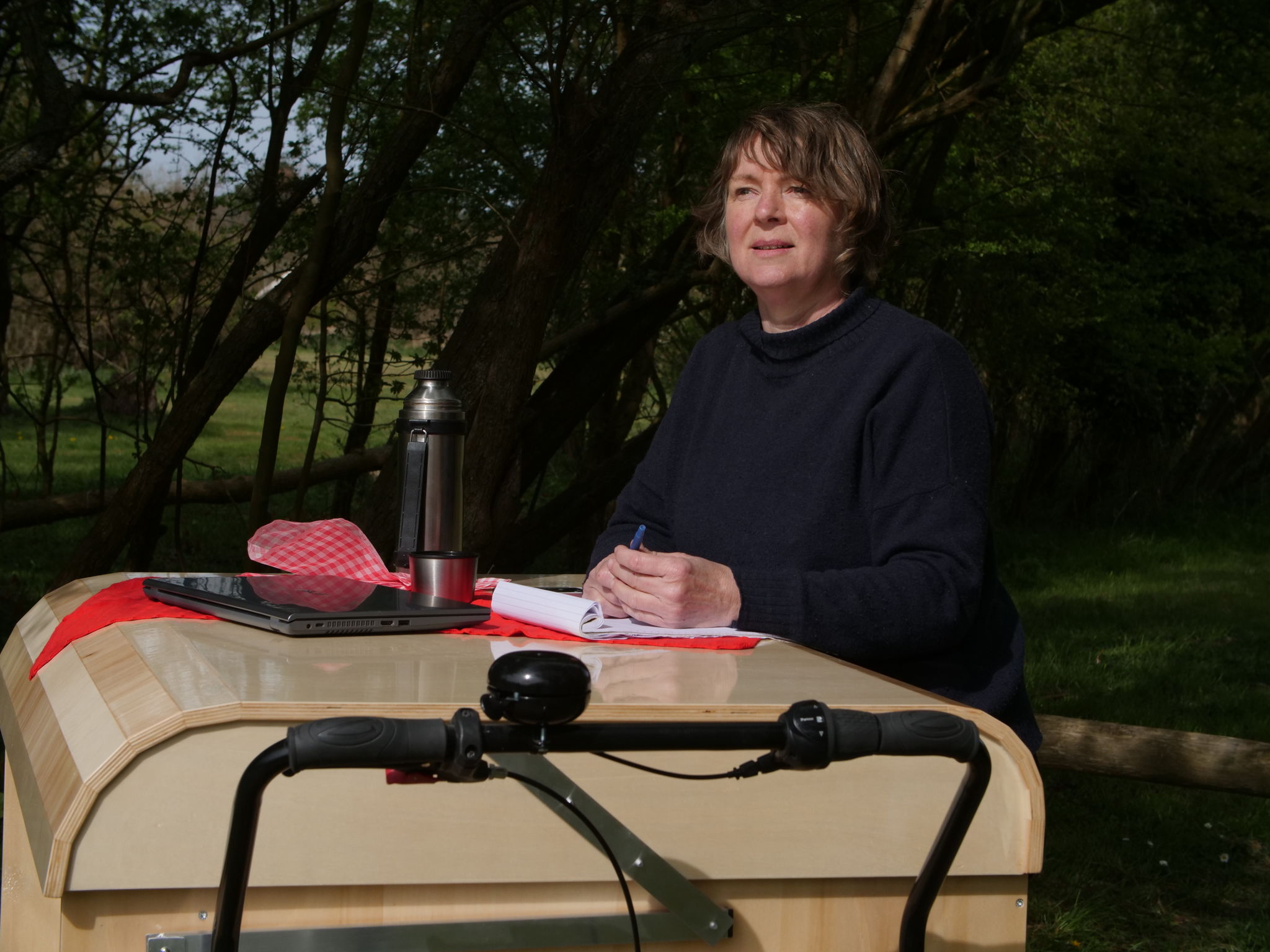 The office is built on an existing lightweight aluminum bikeframe (from Cristiania bikes) which makes it possible to cycle without the need of electric support. Power supply for devices is available from a strong powerbank (made by Mobisun), that can charge your laptop and phone simultaneously while working. The powerbank can be equipped with solarpanels to charge it. -