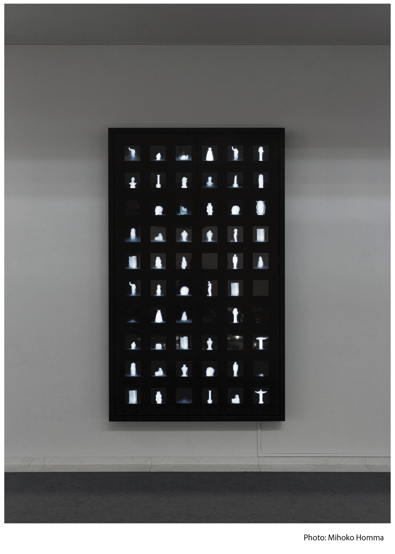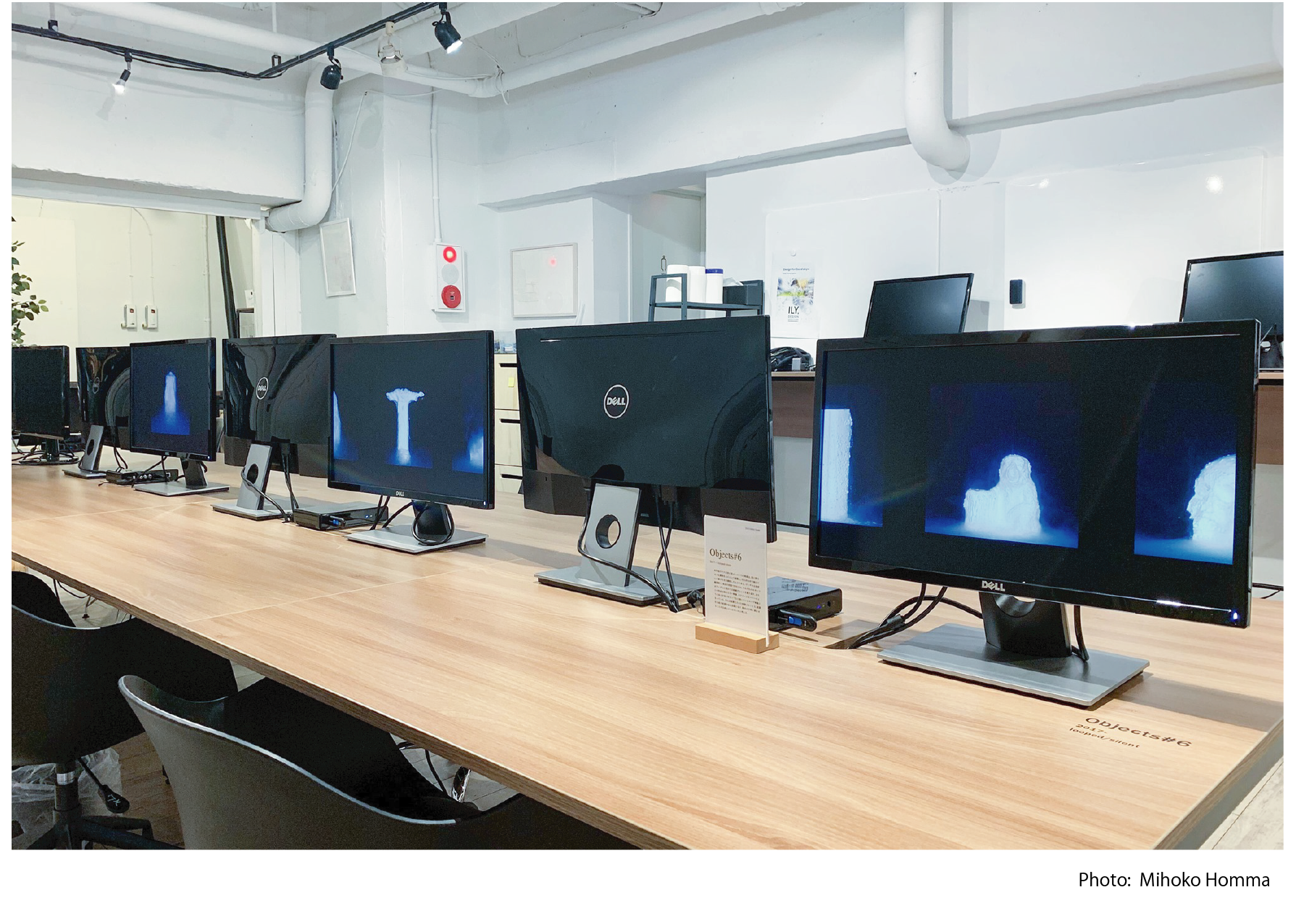 この《Objects》シリーズは、日常空間にある複数の置物を型取ってつくられた白い物体が水中で刻々と崩壊していく様子を、そのまま再生した無音の映像です。全体の画面を通して鑑賞すると、個々の置物は現れては崩壊し消えていく様子を繰り返し、始まりと終わりの繋ぎ目がなくエンドレスな映像となっています。観るというよりは一種の装置としての映像作品、もしくはアンビエントなものに近いと思っています。未来の壁紙のイメージです。