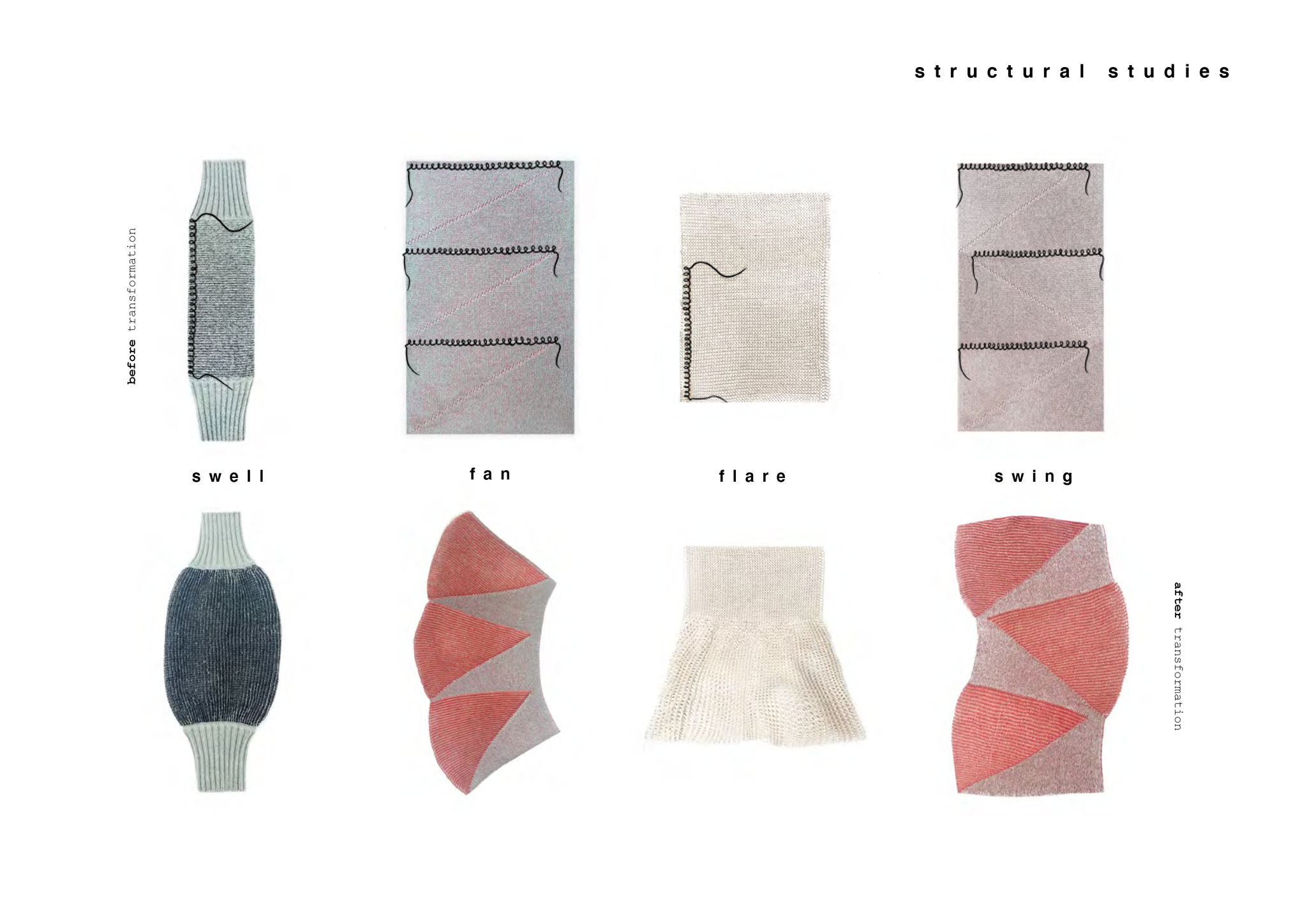 During my initial research, I studied how the technique I developed could simplify garments’ construction, becoming the tool to achieve curves and tridimensional shapes. This reduces the need for fully fashioning, making the production more sustainable and cost-effective. Consequently, inspired by the ideas of famous pattern-makers like Usha Doshi and Tomoko Nakamichi, I created garments patterns using basic shapes, such as rectangles or triangles, so that it would be only by taking advantage of both the properties of knit and specifically of this new technique that it will be possible to achieve more complex forms and volumes, making the change more dramatic. To test this idea, I worked on a series of small-scale knitted structures, and I assigned each one a name that evoked the kind of transformation that the fabric was going to achieve. The possibilities were many, but due to time limitations I explored the ones that seemed most promising, and these also ended up informing the design of the garments composing the final lineup. We have “Curve”, “Swell”, “Flare”, “Fan” and “Swing”.