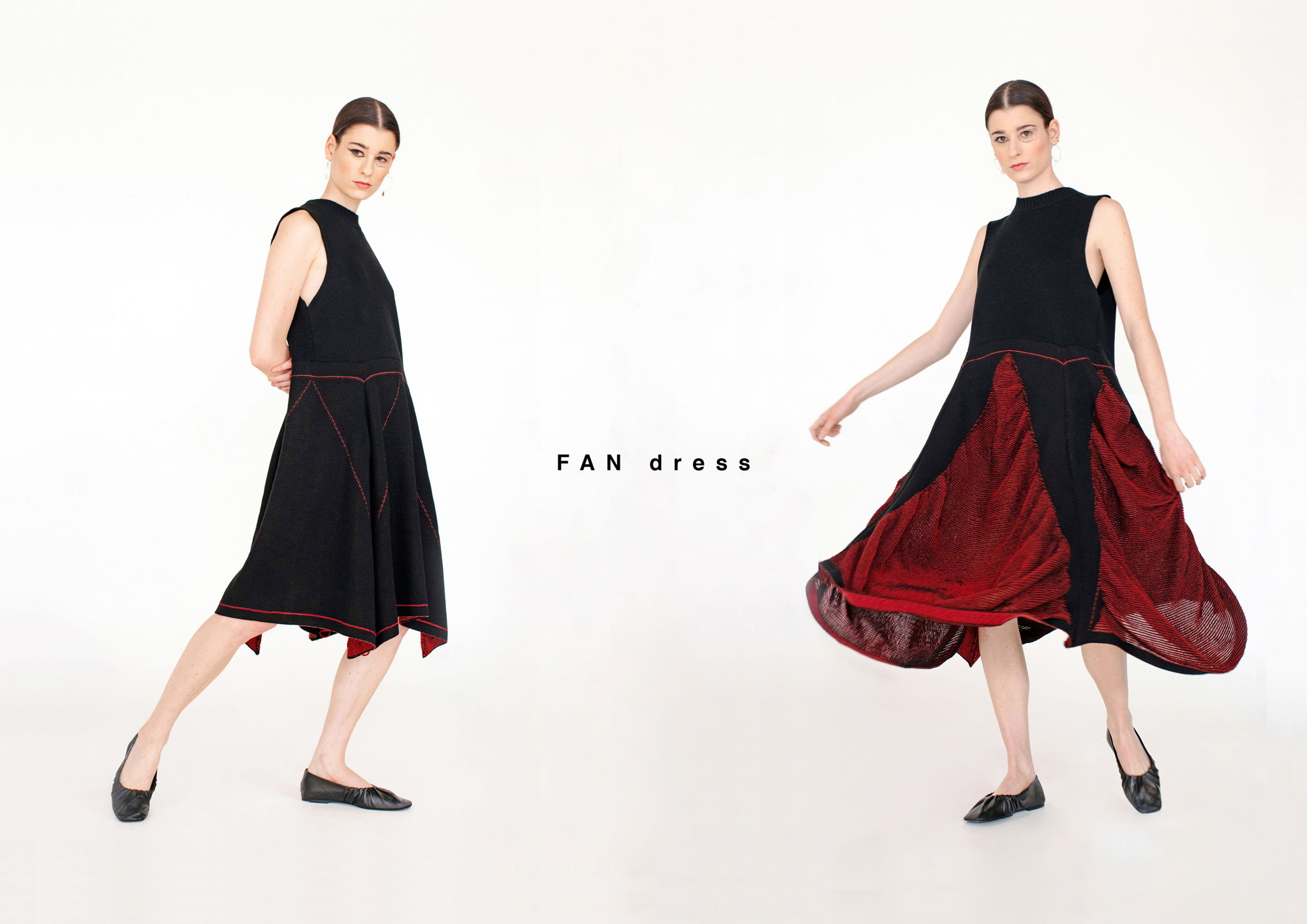 FAN Dress: weight: 770g, production method: Shima Seiki digital knitting machine, yarns: Cashmere 2/27 (Loro Piana), Serafil 10 Tex