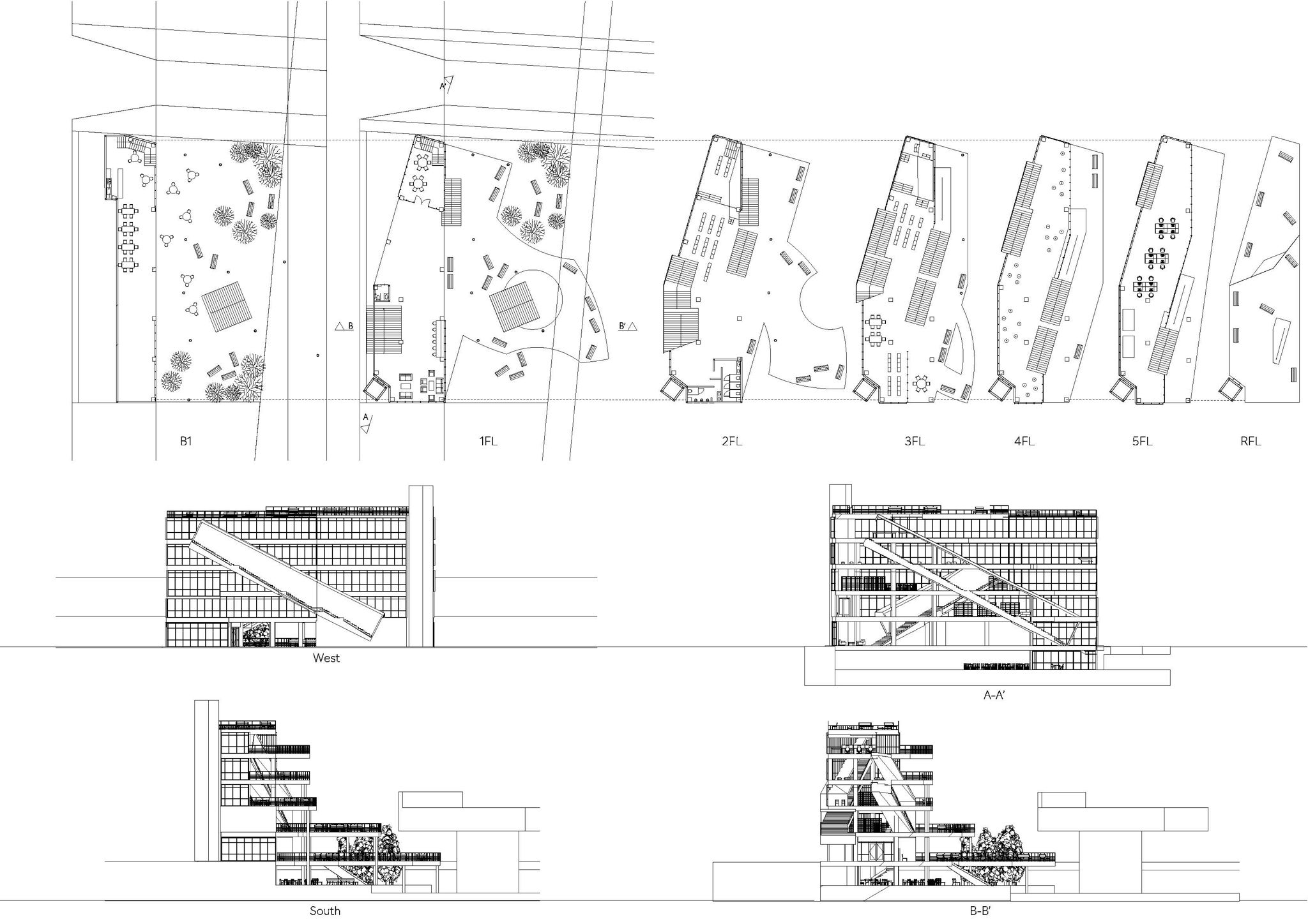 大きく外部に開いたゾーニングは、外部の自然環境を内部に取り入れるとともに外部への誘発を促している。また、それぞれのワークスペースへのアクセスを多様化し、二重階段で二層化することにより更なる目線の変化を感じさせている。交わりも同時に生まれる。これらのことにより「変化する目線、多様な空間、選択する目的」から「好きな時に、好きな場所で、好きなことをする」という自由で鮮やかな盛り上がりを設計した。 -