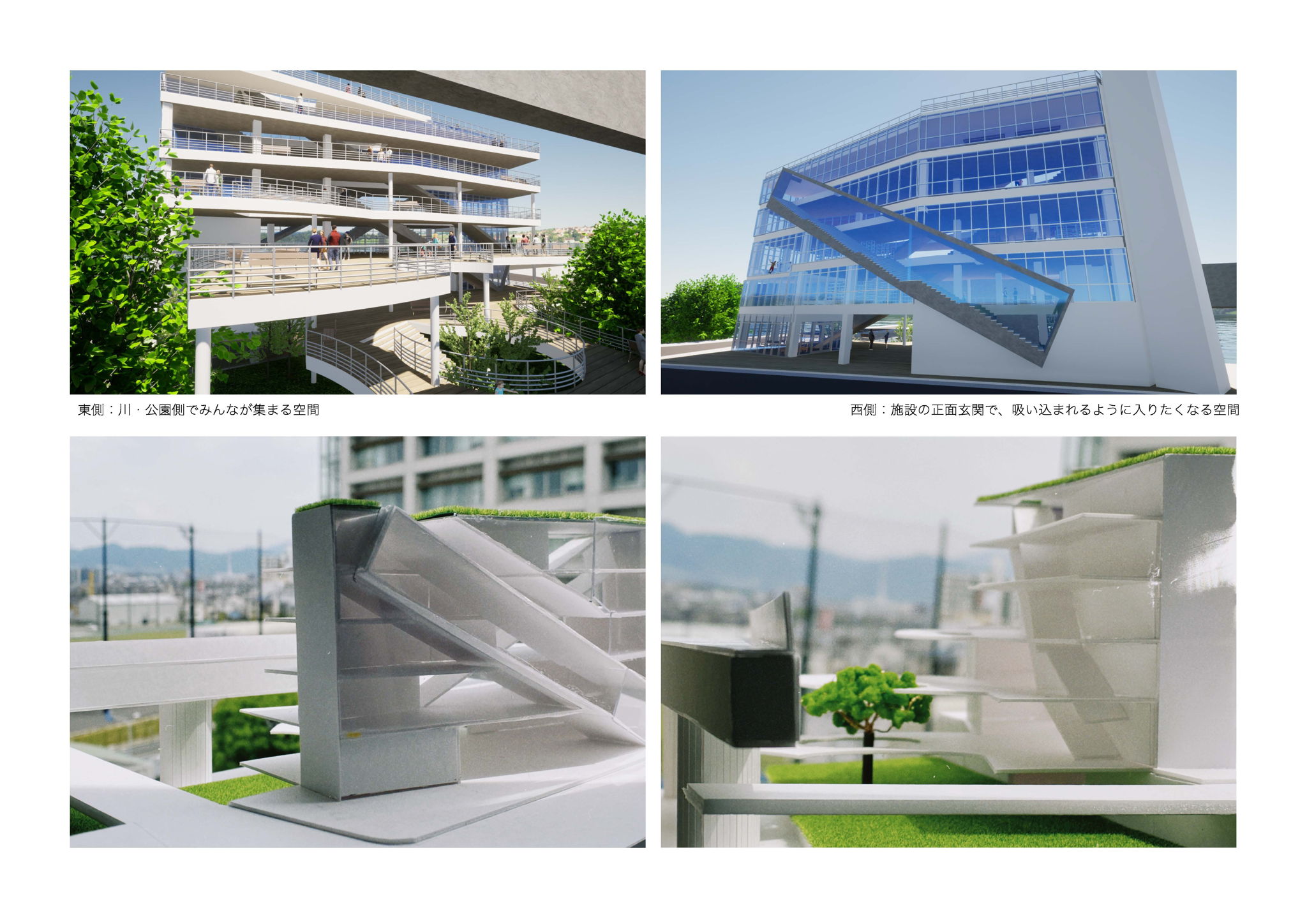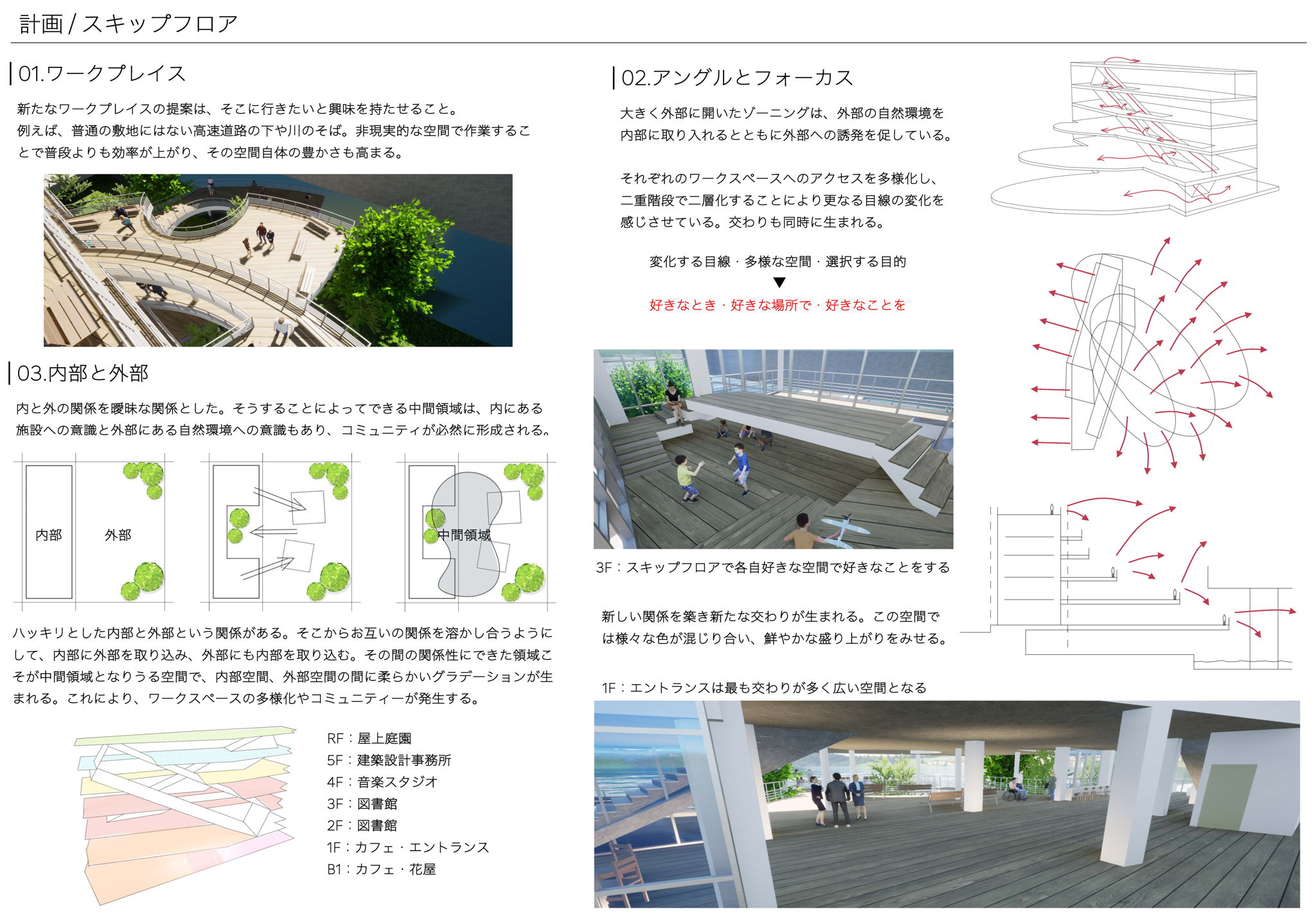 コロナ禍で活躍し愛される建築とはどのようなものなのかというものを見直し、集まりたくなる建築を考えた。川があり近くに高速道路が通っている特徴のある敷地なので敷地を大いに利用した。川という大自然と高速道路という非日常を組み合わせ、そこで作業したくなるような多種多様なワークスペースを作り、それらをうまく繋ぎ距離が遠くともそれぞれが近い関係となる。目線の変化によって日々新たな発見ができるようにスキップフロアにし、様々な関係を生む。